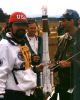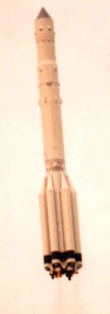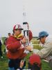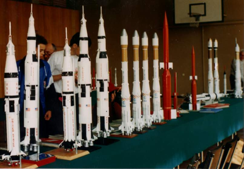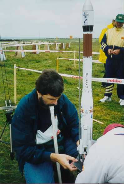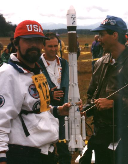 | FAI Scale (S7) FAI Scale involves documentation data that includes dimensions and photographs of details. The models are measured and judged for accuracy, difficulty, and workmanship. In S7 (scale), extra points are given for the flight including clusters, staging, R/C, etc. In S5 (Scale Atltiude), the altitude is added to the static judging score. For more on FAI go to the USA Spacemodeling page  | |  Multiple Champion Bob Biedron's Silver medal Ariane (S7) at 1996 WSMC in Slovenia. Boost on E30 & 6 A's with R/C ignition of 2nd and 3rd stages (pop-out fins). Also shown, George Reibeshl and Dave O'Bryan (Click on pic) | To S7 Page on USA Spacemodeling |