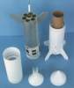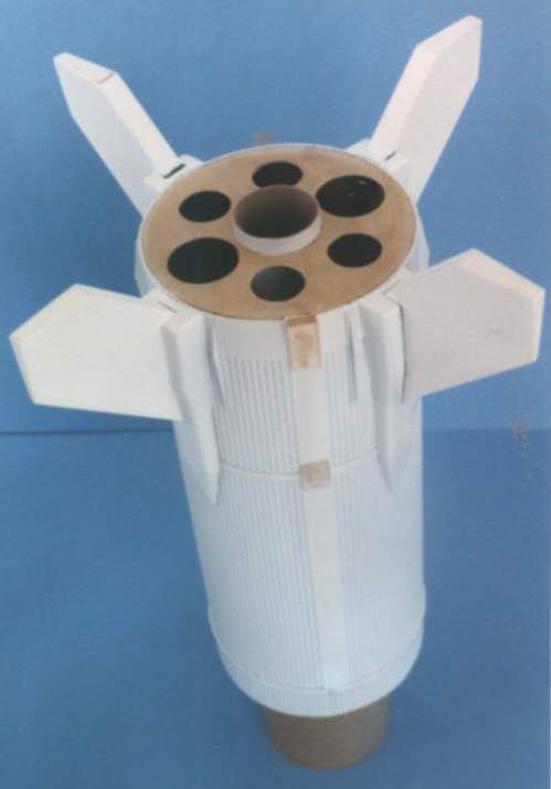 | | Assembly pictures (1990) - click to see larger image, return button to get back 1 - Boilerplate model was built to explore the construction using corrugated plastic sheet curled into a tube, fin attachment, and BT-80 tube for recovery compartment (with a printed wrapper for the Service module pattern). Service Module slips on and is replaceable, "Regional" Little Joe model (being built in these pics) has gone thru at least 4 Service Modules due to accumulated wear and tear. Much use of vacuformed parts, including the BPC/Capsule cone , nozzles, and fin root fairings. 2- The scale of 1/39.5 was determined by a12" wide piece of Evergreen "Metal Siding" plastic sheet with .10" spacing to produce the necessary 120 corrugations (result is 3.89" diameter tube). Much use of vacuformed parts, including the BPC/Capsule cone , nozzles, and fin root fairings. Little use of casting due to not discovering the joys of Alumilite by then - the cast fairing translucent pieces on the system tunnel plate are polyester resin, not recommended these days. 3- Tower built from 3/32" and 1/16" plastic tubing using a jig to hold two vertical struts and the horizontal struts (jig not shown). Alignment of tower top to cone, and alignment for attaching LES motor and skirt was done by making a special jig (shown) to hold all parts centered. When in doubt... "get jiggy with it".... |