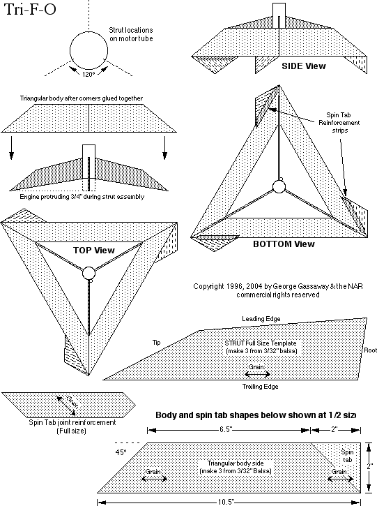 Tri-F-O © copyright 1996, 2004 by George Gassaway & the NAR Commercial rights reserved The name Tri-F-O stands for Triangular "UFO". This model is a relatively easy to build balsa model which flies somewhat similarly to the circular cardstock Flying Saucer introduced by Centuri in 1977 and also in plastic from by Estes years later. The model is primarily built from 3/32" balsa. Non-wood parts required are one 2" length of 18mm tube for the engine mount, an engine block, and a launch lug for flying off 1/8" launch rods. The plan shows full size templates for the struts and spin tab joint reinforcements, photocopy them so as not to cut into the magazine to use them. Due to space limitations the triangular body side and spin tab shapes are shown 1/2 size, but those are easy to draw out. Cut out all parts, being careful that the wood grain runs in the right direction. Prepare the wood parts by sanding the leading and trailing edges of the struts, the leading edges of the side plates for the triangular body, as well as the trailing edges of the spin tabs. Sand the 45 degree diagonal edges of the side plates to a bevel of about 45 degrees, so the joints will match up well when the three side plates are glued together. Finish: If you want to have a smooth finish on the model, it needs to be done before assembly as most of the balsa surfaces cannot be easily reached by sandpaper after assembly. A coat or two of sanding sealer is all that's needed for a somewhat reasonable finish. However, the prototype had no sealer, it was sanded smooth then after assembly sprayed flat white for an undercoat and fluorescent orange for the final color. Assembly: Use tape to hold the edges of the side plates together, to create the triangular body. The tape should go across the top of the corners, and the placement adjusted so that the three side plates are held aligned in the proper position for gluing. Use thin Cyanoacrylate glue (CA) along the inside of the corners (opposite of the side with the tape) to tack-glue the side plates together. After the CA has cured, remove the tape, careful not to pop the tack-glued joints loose. Than use more CA along the inside of the joints for a solid bond. Be careful not to use so much CA that it runs. After the CA is cured, use sandpaper to round off the sharp outer corners of the joints. Use the guide in the plan to mark onto the engine tube the location for the 3 struts. Use a door jamb as a guide to redraw those marks into parallel lines for the strut roots. Insert a standard size 18mm engine into the engine tube, using tape for a friction fit so the engine top is flush with the top of the engine tube. This should leave exactly 3/4 of the engine protruding down from the tube. Place this on a flat surface. Hold one of the struts in position alongside the motor tube, with the trailing edge of the strut root even with the bottom of the motor tube. The tip of the strut should just barely touch the building surface, as the strut has 3/4" sweepback. Apply a little CA to tack-glue the strut into place on the engine tube, being careful not to let the CA run to accidentally glue the engine into the tube. Repeat with the other two struts. Remove the engine. Since the struts may not be exactly 120 degrees apart, lay the strut/tube assembly upside down into the triangular body assembly (also inverted). With the strut/tube assembly centered, carefully pry the struts if necessary to get them seated into the inner corners of the triangular body. Then apply CA for the root edges of the struts, along the tube, to permanently glue the struts to the tube (do not glue to the triangular body yet). Insert the engine back into the engine mount tube, leaving it hanging out by about 1.5", with a slip-fit that is not too tight or too loose. Set the strut/mount assembly onto a flat surface, with protruding engine holding the assembly above the work surface. Carefully slip the triangular body down over the strut tips, keeping it centered. Press so that the engine tube/strut assembly also slides down the engine, until the triangular body touches the flat surface. If you have done this right, the engine bottom is still flat to the work surface, assuring the engine tube is properly aligned. If not, repeat the process to get it right. When you're sure it is aligned, apply some drops of CA to the strut tips to tack glue them to the inner corner joints of the triangular body. After curing, lift off the model from the surface and apply more CA to make the strut tip to body joints permanent. To help even out any errors in alignment, as well as add some extra flair to the flying, the model uses spin tabs which also look like landing pads (OK, sort of...). Making sure the spin tab grain is in the correct direction, glue the spin tab root directly to the trailing edge of the side plate, so that the tab is the same angle as the side plate. Make sure all three tabs are located to the same corners in order to produce the desired spin. The prototype had a problem with spin tabs getting broken in transport, so the plan shows a 1/2" wide reinforcement strip. The reinforcement can be 1/32" plywood, or 1/16 to 3/32" balsa. Glue the reinforcement strip to the underside, half of it across the spin tab root and half across the side plate, as shown in the bottom view. Remove the engine from the tube, and glue in an engine block (or 1/8" tall piece of burned out casing acting as an engine block). Glue a launch lug to the engine tube, at the root of one of the struts. The model is now complete, other than adding a final finish. Color as desired Intended engine power is B6-0 and C6-0. B6-2 or C6-3 engines are not recommended due to the potential to eject too close to the ground. Tape the motor in for a friction fit. When flown the model will climb to about 100 feet on a C6 motor, spinning slowly. When the motor burns out, the model will come to a stop almost immediately, then flip over and descend while rotating. Due to th