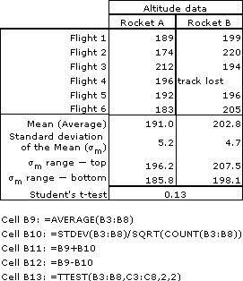 The significance (or lack thereof) of your results One thing that the judges are especially looking for is that the contestant is not drawing incorrect or unsupported conclusions from their observations and experimental results. This can arise for two reasons. First, the contestant may not have enough controls or checks in his/her experimental process. For example, if you are doing a lot of flight tests with several different models, you need to check for and record possible differences between the models. Do they have the same mass, surface finish, fin area, frontal area, etc.? Also, follow procedures that help to 'randomize' the effect of influences that you may not consider or can't control. For example, if you are comparing the performance of A vs. B engines using what you think are two identical models, don't fly all of the A engines in one model, and all of the B engines in the other model; divide the two types of engines evenly between the models. Similarly, if you are comparing two different types of models, don't make all the flights of model #1 in the cool, clam morning, and then make all the flights of model #2 in the hot, windy afternoon; mix the flights together so that external changes affect both groups equally. The second reason people draw unsupported conclusions is that they don't consider whether any differences in their results are statistically significant or not. For any quantitative data it is a must to have some statistical analysis. Most importantly, you need to have enough trials of an experiment to get statistically significant results. One to three trials is much too few to get significant results; ten to twenty would be much better. At a minimum, you should calculate the 'mean' (average) and the 'standard deviation of the mean' ( The short technical report Basic Statistics for R&D by NASA astronaut and rocketeer Dr. Jay Apt, available from NARTS (www.nar.org/narts), discusses in detail the calculation of mean and standard deviation of the mean. This is an estimate of how far your calculated mean is likely to differ from the true mean that would be found by doing a very large number of trials. There is a 68% chance that the true mean lies in the range ± If the Figure 1. Rocket data example spreadsheet ![]() Rather than duplicate Dr. Apt's report by demonstrating how to calculate the mean and The spreadsheet shows two sets of rocket altitude measurements and the mean (average) of each set. But is there a significant difference between the means? Using the The Student's t-test formula in cell B13 is another statistical test that Excel can perform. The result shown tells us that there is only a 13% chance that the two data sets come from the same population, another indication that the data are significantly different.