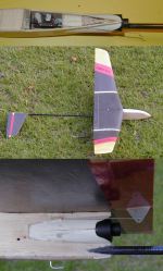 | The results of the Gearcam from the day's flying was pretty good. The mirror method works, but needs some fine tuning. Actually I'm going to try to work out a method to rotate the camera 180 degrees and not use a mirror (Something Steward had suggested but I thought the mirror would be a better way). That would solve the mirror image problems that had to be fixed in iMovie, not just left-right but on boost everything is upside down. Also it can probably be done by putting the camera into a double ended nose cone pod assembly so it would have far less drag, just held 2" or so above the wing by a 1/8" pivot rod or something like that. Weight can be drastically reduced too. I have gotten some 145 mAh Li-Poly cells. Two cells in series produce 7.4 volts. I can use that to power the Gearcam, adding in a 5V voltage regulator. I can also power the R/C gear on another 2-cell 7.4V pack, using a 5V regulator. The two separate packs (4 total Li-Poly cells) will weigh about the same as a 50 mAh Nicad pack (not including the 5V regulator mass, maybe 2 grams per), so the weight added by the 9v battery will be eliminated. I can remove the flap servo in the fuselage under the wing, to save some mass and allow room to move the receiver from the nose to where the flap servo is currently located. Then add a servo to the nose section, about an inch or so ahead of the wing (the V-tail servos are located side by side right ahead of the wing), for a servo to drive a pushrod to rotate the camera pod assembly 180 degrees. The Li-Poly battery packs would go into the remaining space in the nose, moved around as needed to hopefully get the right glide CG without needing to add tailweight. The model would still weigh more than without the Gearcam, but not nearly so much extra weight and with a lot less extra drag. Actually, if all I wanted was to just get a fixed view of the tail, or view forward, without changing the view in flight, the weight could be just a few grams more since the two Li-Poly packs will almost equal the 50 mAh Nicad pack, and removing the flap servo would almost equal the weight of the Gearcam. | |