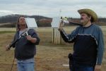 | Flights at the February Birmingham Rocket Boys Launch, at the Phoenix Turf Sod Farm. A Cuda-Flap model made in 2001 for the FAI S8-P event, for "Precision Landings", was brought out of mothballs (It had been superseded by the Stingray-Flap models Phil Barnes made with Dave O'Bryan in 2002). The Cuda Flap model was flown at the January launch on staged C6's, to see how well it worked out. It was OK, at least C6's are available, but Aerotech may be making the R/C reloads again this year. To use the Gearcam aboard the Cuda-Flap model, a special mount assembly was made out of 1/32" plywood. It was made to mount the camera looking "up" as seen in glide. A pivoting mirror set up above the lens at nearly 45 degrees to look to the back for boost, and then rotate to nearly 45 degrees forward for glide (Biased to look a bit down). The assembly was made to be temporarily attached to the glider by using vinyl tape at front and the wing bolt at the rear. The Cuda fuselage was modified a bit to allow for a short pushrod to extend a bit out of the side of the fuselage, so it would retract when the flap was briefly deployed. When it retracted, it would release a thread that holds the mirror looking to the rear, allowing a rubber band to flip the mirror to the front. I had wanted to use the 9 volt battery to power both the camera and the R/C gear (by using a 7805 regulator). But it turned out that when sharing the same power source, the camera picture was affected very badly any time a servo was moved. So, the model had to fly using its normal 50 mAh Nicad pack for R/c, plus the 9v battery externally. The battery was 37 grams, camera mount/mirror/wiring assembly 15 grams, and the camera 10 grams. So, 62 more grams for a model that has a 204 gram glide weight with a burned out E6 reload in it (266 gram glide weight with the Gearcam stuff aboard). At the launch, Ron Witherspoon manned my high-gain 14db receiver antenna assembly for some of the flights. Steward Jones used his own Gearcam receiving equipment, hi-gain antenna, and digital video camera to record some of my Gearcam flights, for others he used his digital video camera to get ground-based footage of the flights. Steward & I made our own versions of hi-gain antenna pointers using 1/2" PVC pipe and PVC fittings, as seen below.
