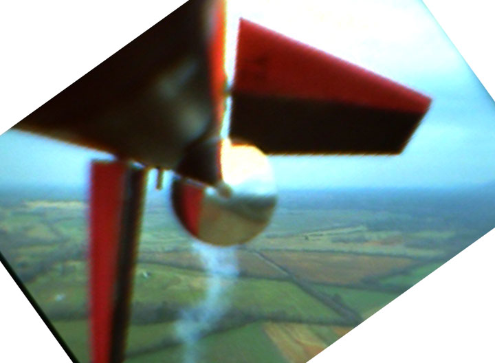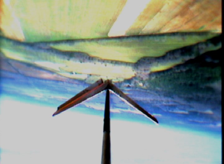 A big surprise in reviewing the video was that for a very brief time on boost, the camera pod rotated about 90 degrees, then rotated back to a rear view. Strange. I noticed on a few occasions in other boosts where the tailboom seemed to move a bit from left to right, that probably was the camera pod mount rotating a tiny bit. It also seemed to occur a bit during some forward looking parts of the glide, when pulling high speeds or dives. Some tweaking of the rotating pod system seems to be in order. The video shows from lifotff to landing, with some sections cut out for time, 240 x 170 resolution, a 1.7 meg Quicktime movie | |
