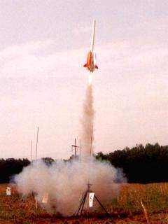| A different kind of model, a Zagi flying wing. The Zagi is a 48" span R/C slope combat glider. This one was convertedto boost on rocket power, using F13 and G12 reloads. It is quite aerobatic, thanks to its use of full-span elevons. To find out more about the Zagi flying wing, go to the Trick R/C (Zagi) home page Photo courtesy of Ronny and Greg Tipps of Waverly, Tennessee.