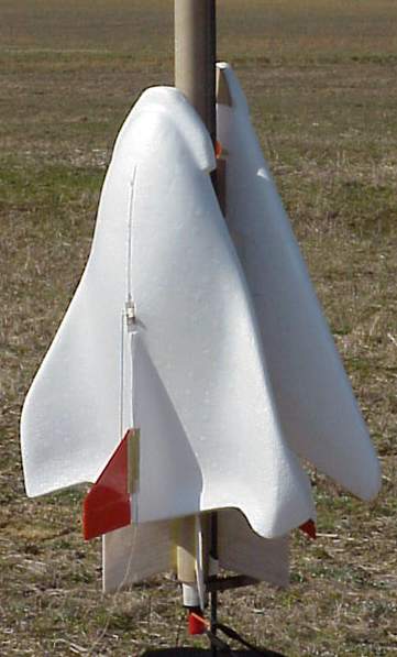| The model airplane company named "Robart", best known for R/C airplane accessories such as retractable landing gear, has come out with a series of styrofoam "toy" gliders, which they call their "Top Gun Gliders". The three out so far are the F-16, F-117, and "UFO". The UFO is sort of like a blended-body hybrid of a flattened lifting body with sort-of regular outer wing, except it has an "alien" style of design appearance to it. The F-16 was a bit too big and the F-117 a bit too tricky to do the rudder-only piggyback conversion. I chose to use the UFO design to convert to rudder-only R/C, adding a removable fin/rudder to the top. Installing the radio gear itself was pretty easy, cut a hole just the size of the servo into the top of the "body" and jammed the servo into place, with a hole running down to run the servo wiring. The servos used for both gliders were old Cannon super-micro servos, nowadays there are a nubmer of 1/2 oz or less servos available cheaply. The receiver (Hitec 555 micro) is mounted into the belly, into a rectangular hole cut into the foam. Same for the 50 mAh nicad battery pack. Glide weight of about 6 ounces. EACH. Why each? Too tricky to work up a good way to piggyback a glider with this size and mass, and not as much fun either, so two were converted to fly on opposite sides of a piggyback booster. One painted orange so the pilots could tell which was which. The booster is 56" of BT-70 (Totally Tubular), ejecting in the middle, plus a BMS BT-70 nose cone. First flight was on an F22J-5 reload. Unfortunately it turned out to be too long of a delay and ejected late, and into the sun. So, the flight was successful but not very long. And right after that flight Gene Hornbuckle, who was the pilot for one of the gliders, had to leave (Gene is a very experienced R/C sailplane flier as well as rocketeer). His replacement was SEP program manager Greg Warren, who had never flown R/C before. Well, this is also part of what this is about, something for newcomers to try to fly. But it was a bit windy so there was potential for an unpiloted or badly piloted model to glide far far off, fortunately Greg had done R/C cars before so he had experience with the "coming at you" steering reversal problem (if the model is coming your way and you want it to go to your right you have to steer it left). The F25 took it to about 600 feet, ejecting at about 500 feet. The nose-down dive of 100 feet meant the gliders had a lot of speed when they pulled out at ejection, so they both peeled away in opposite directions and after a couple of stalls, settled into glides. Greg had no problem at all controlling his, and for most of the flight we flew in formation, or about as much in formation as rudder-only allows. Greg landed within 100 feet of the launch site. Flying time...unknown, but probably along the lines of 90 seconds. So, the model(s) worked out just great, as hoped. The "Robart fleet" will be flown at NSL and NARAM. If someone is interested in building their own, let me know for more details. Another exciting thing about this Robart series is that later in the year when they come out with 3 more foam gliders, one is supposed to be a shuttle orbiter. That orbiter will likely be similar in size to the 1/60 piggyback R/C orbiter I fly, which has a span of 18". All these Robart foam gliders have a span in the 16.5 to 18" range. Pictures at right courtesy of Ronny and Greg Tipps of Waverly, Tennessee. Unfortunately, Robart does not list these gliders o n their web page. If your local hobby shop does not carry them, contact Robart. Phone:630-584-7616 Email: robart@robart.com Robart Manufacturing, Inc., P.O.Box 1247, St Charles, IL 60174 | ![]() ![]() |