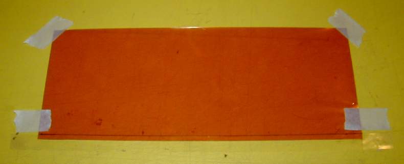 With the tape successfully applied, lay a straight edge or rulerdown across at the bottom edge where the Kapton sheet ends, to act asa guide for cutting the tape off flush with the end of the Kaptonsheet. After cutting the tape horizontally using the ruler, also maketwo vertical cuts at the left and right sides to trim off the rest ofthe tape along the 5/32" wide overlap area.