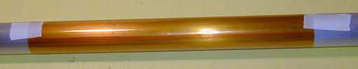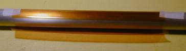 The mandrel should have a line drawn along it that is parallel tothe length. This line will help in aligning the sheet so that thejoint overlap will be parallel and now skewed. Orient the Kaptonsheet so that the unmarked side is at the top of the mandrel, themarked side with tape coming around from the other side. Use maskingtape to tautly hold the upper part of the sheet parallel to themandrel, leaving some clearance for the overlap.