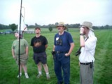 | NARAM-46 update: The scope was used for the first time to pick air for models, at NARAM-46. It worked out well, using the 30 sec/div setting (6 plus minutes plot, with one pixel per 3 second updates). Testing at home had indicated that direct sunlight could make the screen overheat and go dark, so a sunshade assembly was made out of .04" styrene plastic to provide some shade. The Oscilloscope itself was held inside of a big ziploc bag, allowing access to the pushbuttons. The screen was not too easy to read inside of the bag, so a rectangular hole (at screen level) was cut into the bag and a piece of flat Lexan was taped to the bag along the edges of the hole. It was then very readable, though over time (and the high humidity) the tape let go. A more permanent solution is needed. A holster type case is made for the scope, I wish I'd bought it when I got the scope but the shipping cost is a bit prohibitive to do it now. The thermal pole the scope mounted to was itself attached to a special post that was taped to the pole using vinyl tape. The post has a bracket at 90 degrees, near the bottom, allowing a person to "step" onto it to push the post into the ground by foot. So, the pole was very easy to move from one pad area to another, rather than needing to use a hammer to pound the post into the ground each time it was moved. I found the post at Target for $12 in the garden department, with a decorative "hook" at the top. The upper part with the hook was cut off, leaving the post about 3.5 feet long. And the blunt bottom end was sharpened into a two-sided wedge to make it easier to push into the ground. | ![]() (photo by Chris Taylor) |