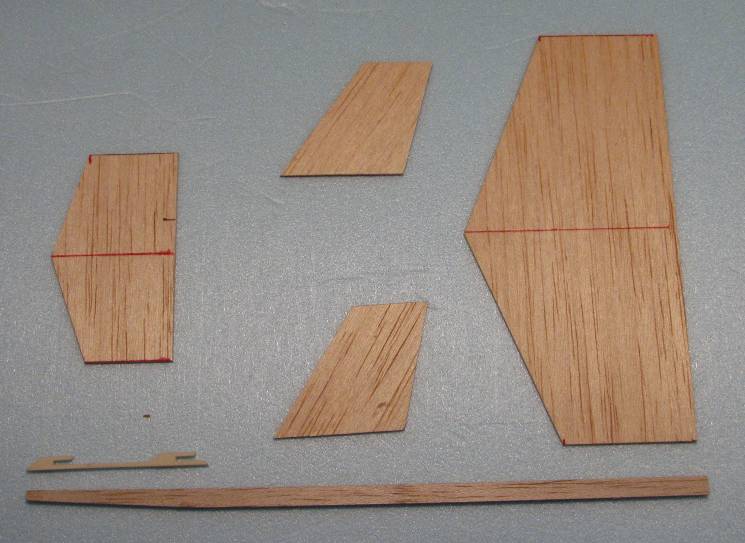| | The parts for the glider. The main wing, canard, and rudders are made from 1/16" balsa. The main fuselage is 1/4" by 1/8" hard balsa. The cast glider hooks are available from George. The glider will fly a little better if you round the leading and trailing edges. A little better still if they are airfoiled. But it will fly without any rounding at all. |
