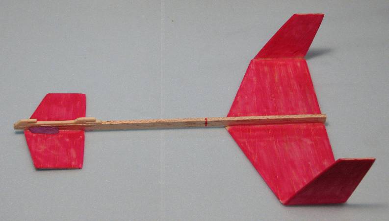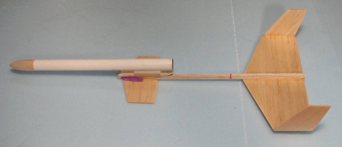 | | Complete Pod with glider after gluing in the shock cord mount ring and gluing on the pylon, lug, and Pod Hook. | | Glider with Pod, in Boost mode. A bit of clay (purple) has been added to the canard/fuselage joint for glide trim. |