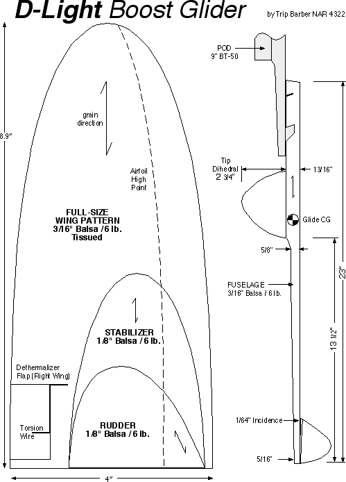 Balsa wood grows in different densities, but generally isavailable in densities ranging from 6 pounds per cubic foot to about20. Most hobby store balsa is in the 10 to 18 pound range, which isfine for boats and for model airplane structural members (and modelrocket glider fuselage booms like the D-Light), but when used onwings it makes for heavy boost-gliders that glide poorly.