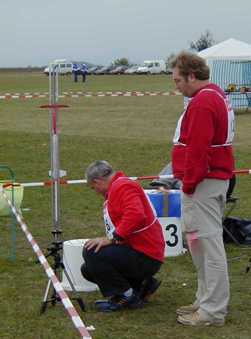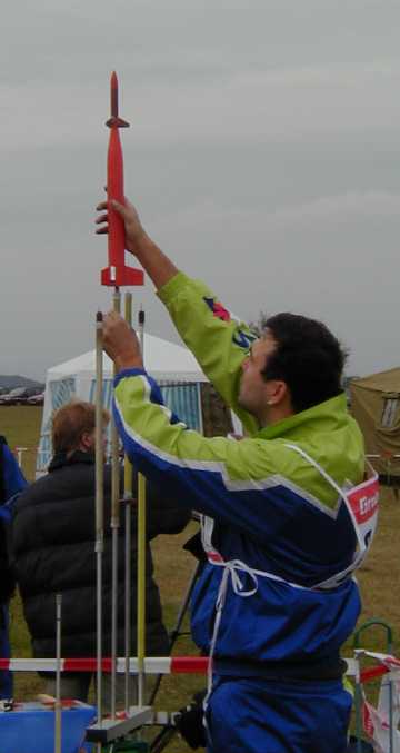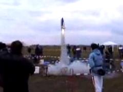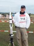| Junior Team manager John Langford talking to Ellis Langford, Fritz Langford, and Abby Clark during S5 (Scale Altitude) | Senior S5 team getting ready to fly. (l-r) James Duffy, Mark Petrovich*, Tom Campbell, Jay Marsh*, & Dr. Bob Kreutz (* - helpers) | Tom Campbell's Bumper-Wac used B6-0 staged to a Delta B2. Launched from a Piston-Tower | Tom's Bumper-Wac during boost. Wind was from left to right, model straightened up to about vertical at staging. |