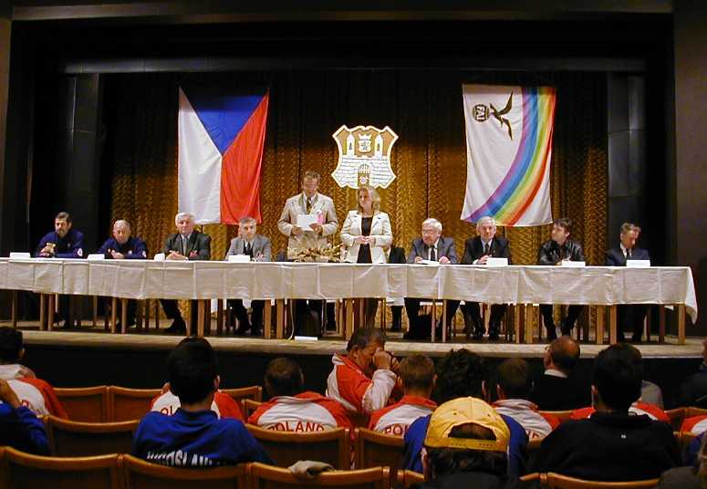 | Team walks to the opening ceremonies | Hotel Sport in background | Bridges across one of the rivers that flooded many areas of the Czech Republic, including Kralupy | Ceremonies held in an auditorium in Kralupy |