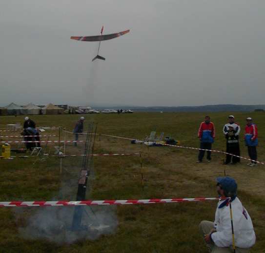 | S8E Team (George Riebesehl, George Gassaway, Dave O'Bryan) D-450 shot by Chad ring | Dave O'Bryan's StingRay-6 liftoff, launched by Andy Tomasch (during S8E World Cup) | Dave O'Bryan (r) flying during S8E WSMC event, as (l-r) Ellis Langford, Ross Hironaka, and George Riebesehl help spot and time (for more S8E photos see World Cup pics on page 3) | |