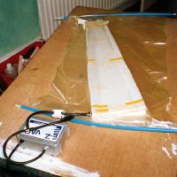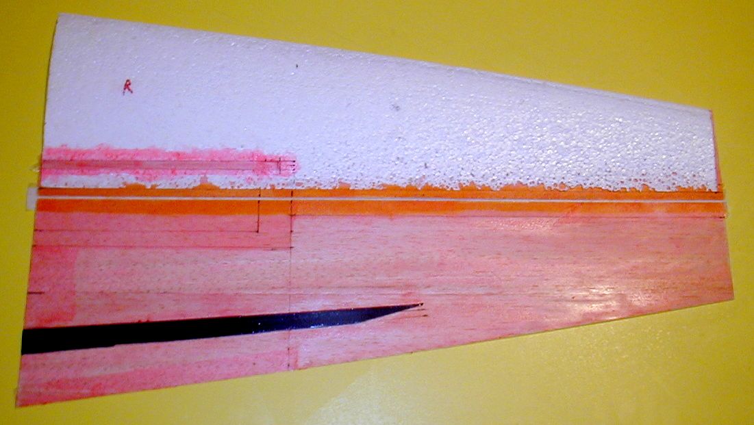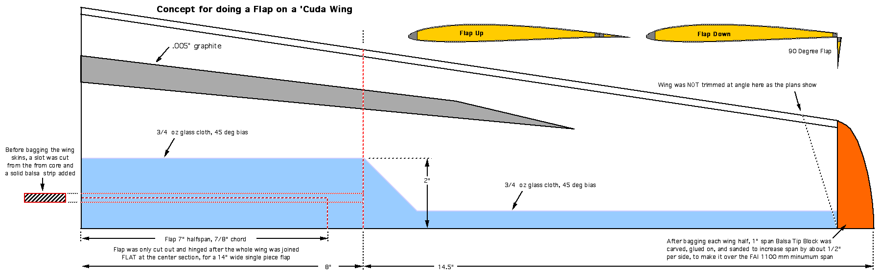 | The wing layup was modified in several ways. It had to be reinforced to make it strong enough for a 14" span (7" half-span) by 7/8" chord Flap to be cut out of it after the wing was completed. This required, for each wingskin, adding some .005" graphite strip in place of the normal fiberglass "spar", and some fiberglass cloth for the last 2" of the wing chord (to Trailing Edge), from Root out past the Trihedral joint. Also, a solid balsa spar insert, laid up during the skinning and bagging process, to give solid support where the hinge line would be cut later. For more info on how the Cuda-Flap wing was prepared, go to the Wing Assembly Page. To increase the span a bit, the tip was not trimmed diagonally as for a normal Cuda. It was left square, then a 1" wide tip block was carved, rough shaped, and glued to the tip. Then sanded to final shape. | |