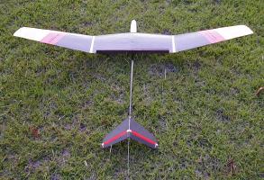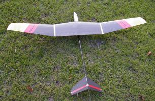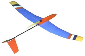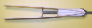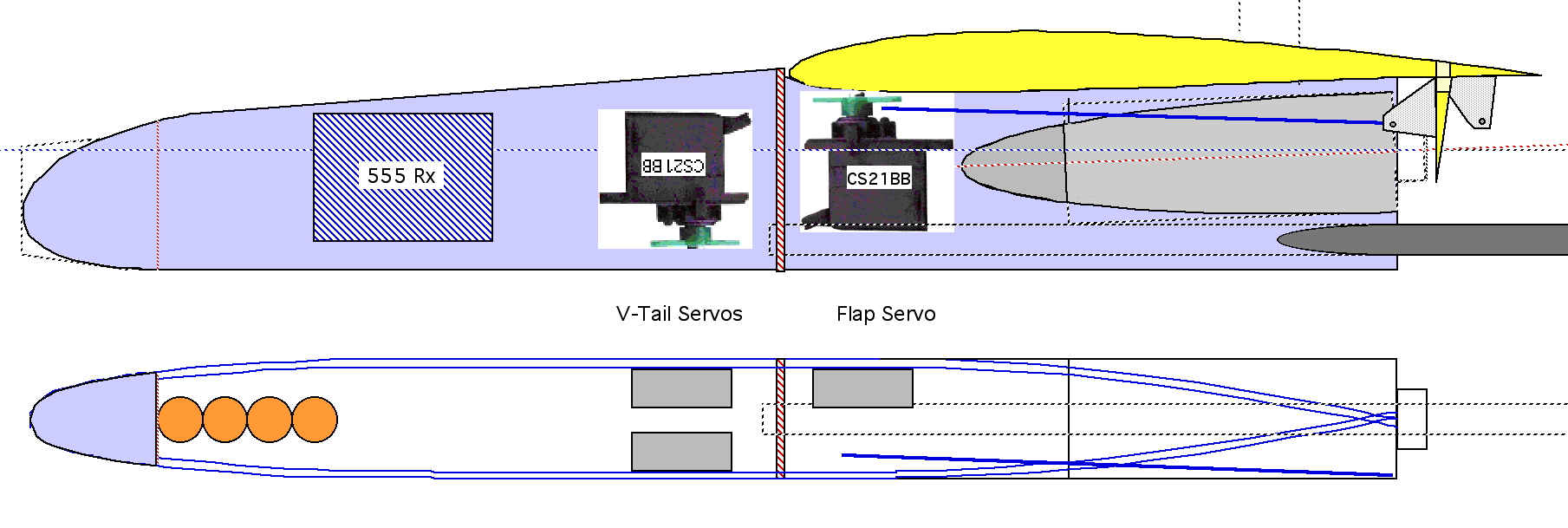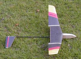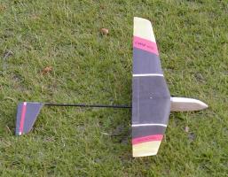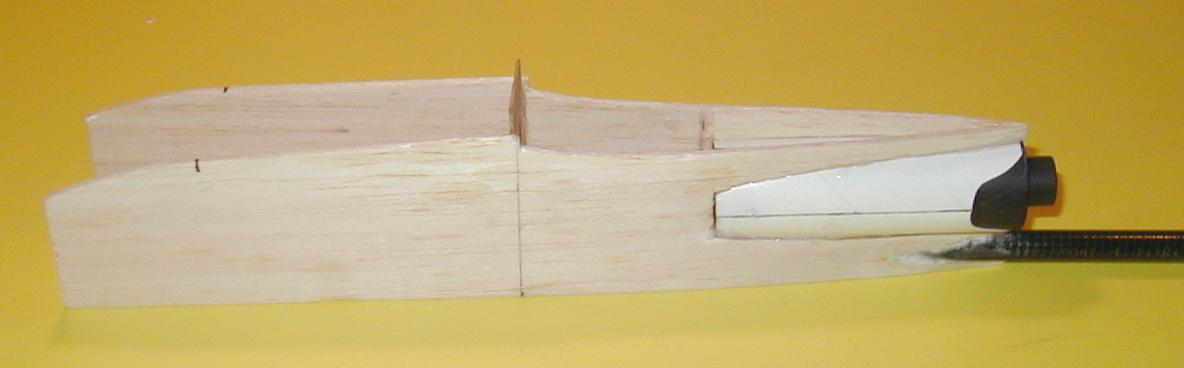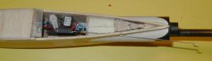 ![]() Balsa fuselage before pinching nose to glue front bulkhead | ![]() Top View | ![]() Completed, with Flap Servo |
