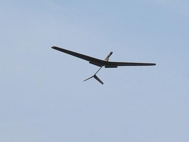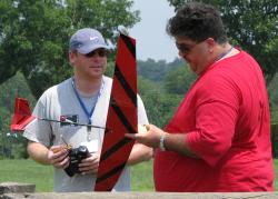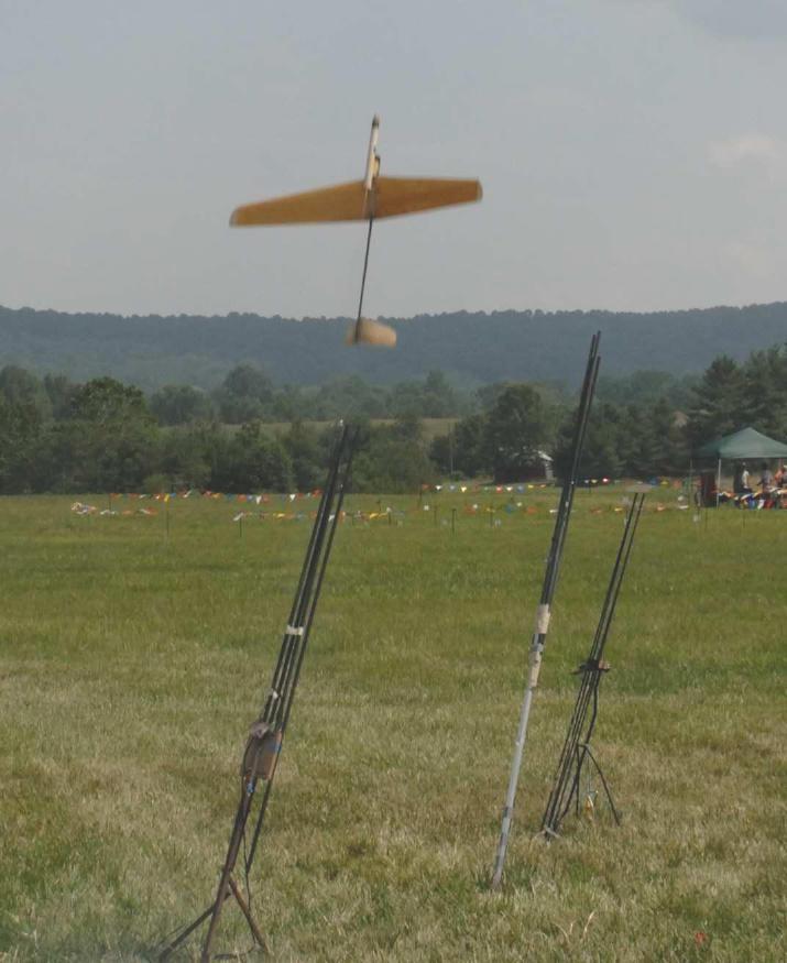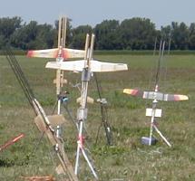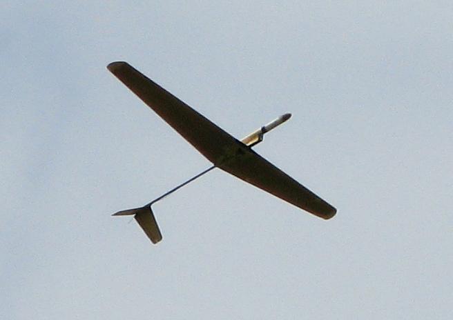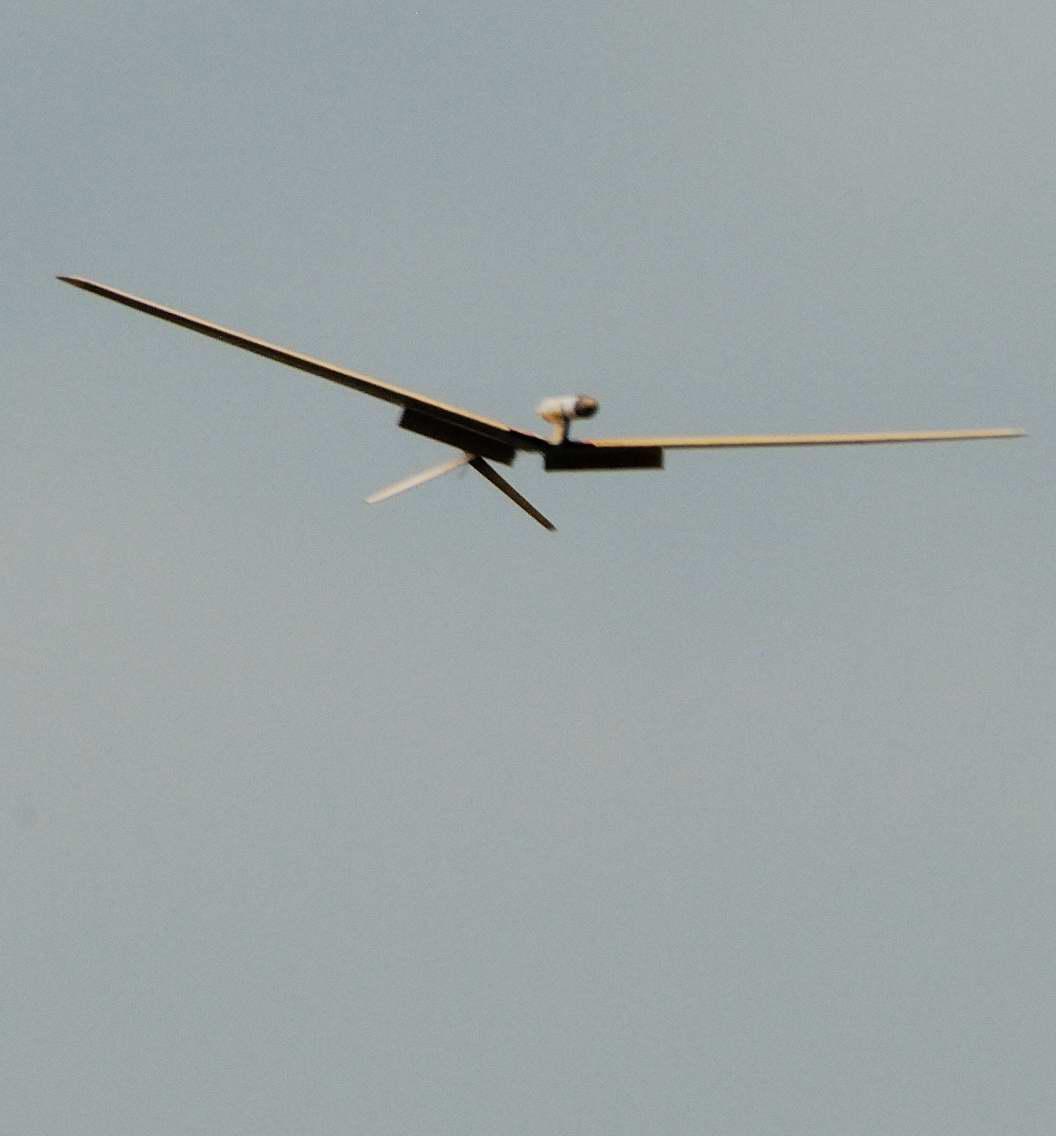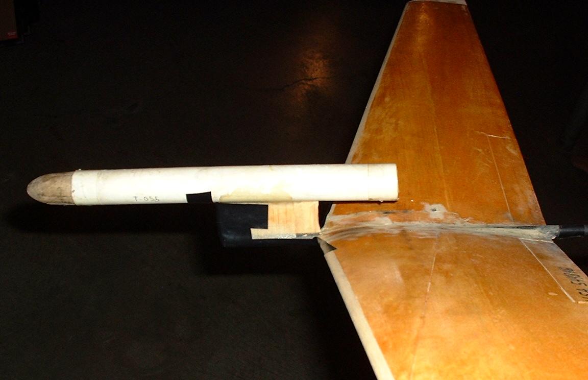 | The Cuda-Flap model worked out nicely. The Flap was very effective. It required a few flights to work out the correct amount of down elevator compensation so that the model did not balloon up and stall when the flap came down, or dive from too much over-compensation. The Flap deployed nearly 90 degrees. That was so much as to make it act like an airbrake. I could put the model into a 30 degree dive with little increase in airspeed, and it could even dive into the ground at 30 degrees without damage. It also could dive more steeply than that, I sometimes dived it at 45 degrees, though it did increase the airspeed a bit, but still nothing like would happen with flaps only deployed at 45 degrees or so. One drawback was with so much drag, when I leveled it out for landing to try to do a final steering correction for the runway tape line, there was very little "hang time" before it would stall and land. In theory I could have been adjusting the throttle stick to vary the flap angle, but I found that it was more practical to go with either all down or retracted. For the flyoffs, the model itself worked well. I made a mistake on one flight and let it land off the end of the runway, caught by the wind. Came in 4th. But months later, George Riebesehl, who had won using a normal Stingray (no flap, no spoiler, no 3rd channel), dropped off the team and I moved up. For the 2002 WSMC, the S8EP Team members used Stingray-Flap models, so I had no pressing use for flying the old Cuda-Flap models. In 2004, when I got a BoosterVision onboard video camera, that changed. I modified one of the Cudas to carry the BoosterVision camera. Eventually, adding a camera pod that rotated 180 degrees after triggered by the flap servo, so it could look aft for boost, and look forward for glide. For more info see the Airborne Video Pages. | ![]() |