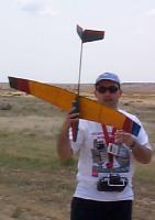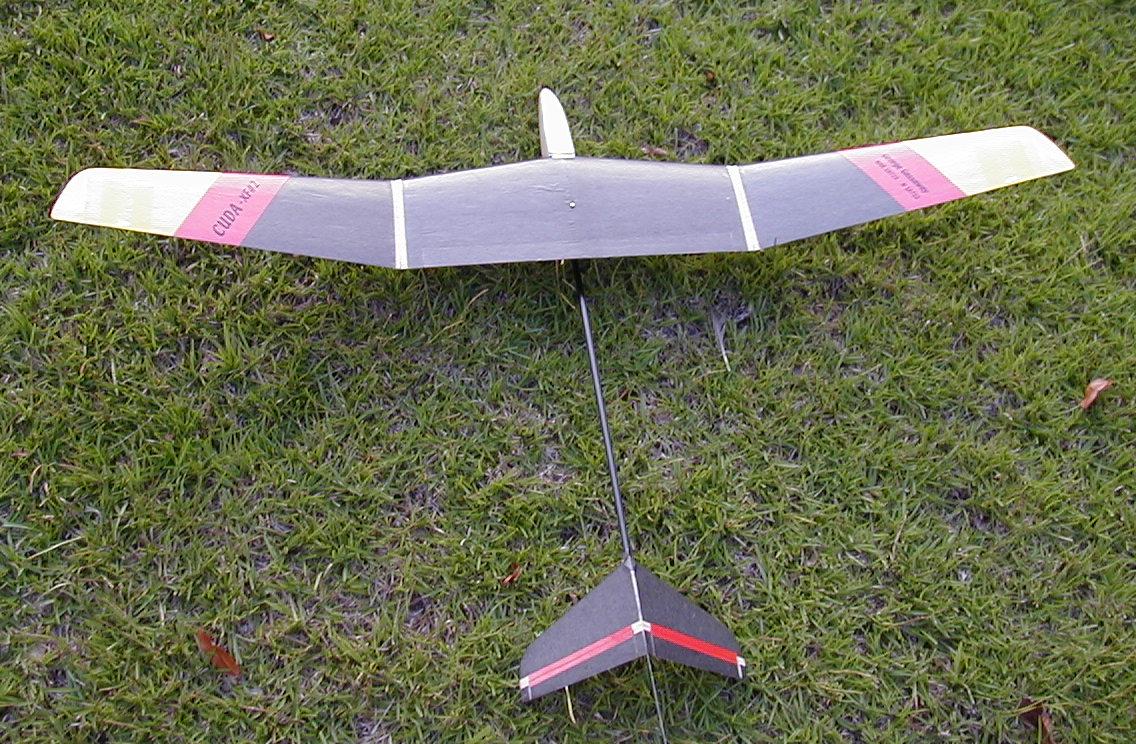 | Cuda Ray by Ryan Woebkenberg Ryan built a flapped model for the very same reason. The S8E-P event, for the 2001 US Team Flyoffs. Ryan also chose to use a Cuda wing, but to modify it. For the fuselage, Ryan chose to use a "Stingray" type of layout. To mount the servos inside of the wings, like a Stingray. And to mount the receiver and battery pack in a pod attached to the front end of the graphite fuselage. As with the Stingray, the wing was permanently glued to the boom. Unlike the Stingray, there are no removable wing panels, so the model has to be transported fully assembled. The Stingray Kits used a molded pod, made of fiberglass, or Kevlar, or even Kevlar/Graphite. Ryan simply used a piece of 24mm tubing, making it long enough not only to hold the engine, but also to hold the receiver and battery (Kevin McKiou's prototype Stingray was made the same way). Running the wiring for inside the graphite boom, thru the pylon. For the wing, Ryan chose to just make it as a simple "Vee" dihedral. With a flap on each side of the wing. He simply used one servo with a "Y" yoke to allow that one servo to move both flaps equally. His model flies well and is a reliable performer. | |