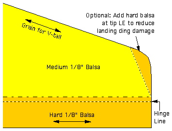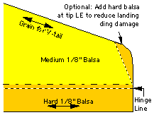 | 1/8" Balsa Tail & Airfoil The Cuda was designed to have a fully airfoiled tail. In reality, most people do not have the patience and/or skill, to sand the airfoil that much. This is also a contributing reason for Cudas to tun out tail, heavy, a lot of the 3/16" balsa was not sanded away. I recommend replacing the 3/16" tail with 1/8" balsa. Either medium-hard sheet for the whole V-tail., or whole horizontal Stab, or better yet CA together some medium balsa for most of the stab to save some weight, and hard C-gain balsa for the last portion which will be sanded to a taper. The reason for using harder balsa there is so that the control surface will be plenty stiff, and not tend to twist under air loads on boost. Since it will be sanded to a taper, you will lose some of the mass of that harder heavier balsa. By only rounding the front, and tapering the back, you will be left with a significant part of the stab that will be flat. For the average flier, that is FINE. An extra benefit of this is that you will be able to align the tail incidence much more accurately than you could judge by eye with a fully airfoiled tail. |
