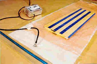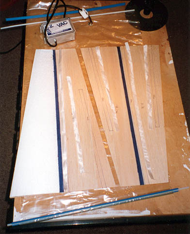 | It is possible to use weights to compress the cores together, as shown in the manual. But do not skimp on the weight, note the manual mentions using 200 to 300 pounds! A Vac-bagging system is highly recommended. Whatever you do, MAKE SURE that once you have the skins and core together, laid correctly into the foam beds, that you use some masking tape to help keep everything aligned. Using weights, it is certainly possible for the epoxy to act like grease, to let one of the skins slide to one side, especially if the weights are not balanced out well. If that happened, the whole wing panel would be ruined At right is a photo model by Alex Seltsikas when he built his Cuda. It shows his wing skins prepared, and marked, with the fiberglass spars and trailing edge fiberglass laid in place of where they were applied after the epoxy was squeegeed on. The photo shows both sets of skins with the masking tape hinge connecting the trailing edges, and the wing core for one wing looks like the right wing's core. The skins and core are laid on top of a Vacuum Bag. | |