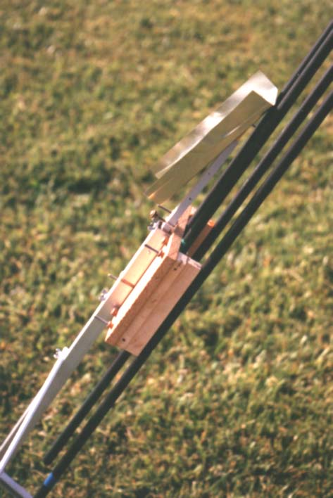 I originally used launch rods for my early R/C Boost Gliders, and even my first R/C Rocket Gliders. But those had issues with binding the rod, and even more problems in wind. In 1986, I decided to get serious about doing R/C R/G, with a new dedicated R/G design (Synchronicity), instead of kludged modifications of old B/G models. To go with that, I also built a Tower. That first tower used 3/4" diameter aluminum tubing and shelving rails for tower rails, plus a very beefy built-up base to mount everything together. It was mounted to my first Omni-Pad, which itself was pretty heavy as it used 1 x 2 wood. The tower worked well, but it was an awful lot to transport to NARAMs and WSMC's. Also, that tower had been built to work with Synchronicity. It was not adjustable however, other than adding in some shims to vary for wing thickness, nothing more.