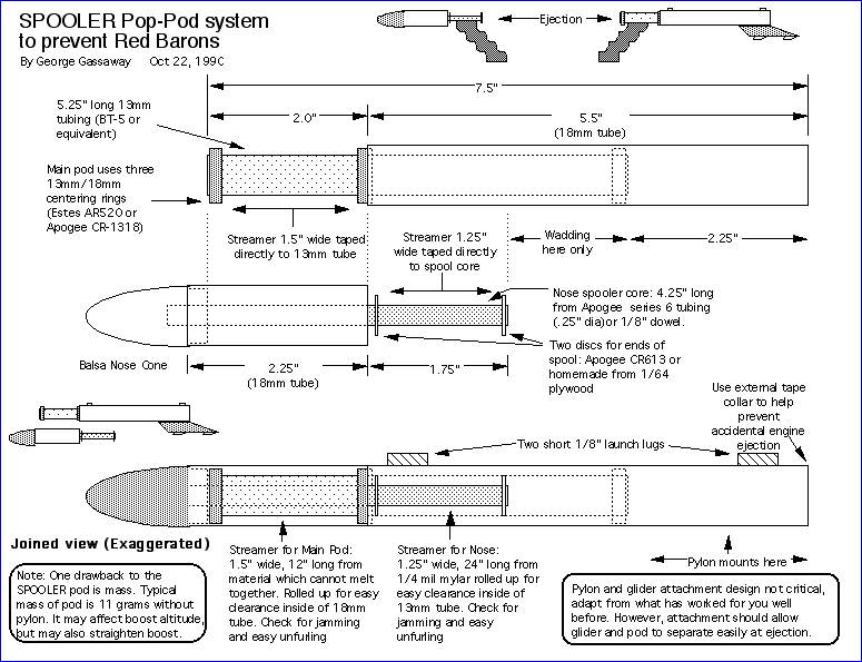 Report Summary: This report is on the development of a pop-pod system which addresses two significant problems for those who fly Boost Gliders. One problem was the pop-pod getting hung up on the glider after ejection, commonly called a Red Baron. Through a series of design improvements and testing, a pop-pod system called "Spooler" was developed. The Spooler ejects off the nose section, which tumbles down safely, exposing a wrapped up (spooled) streamer in the main pod so it can unspool and bring the main pod down safely The other problem was how the glider attaches to the pod. Common hook attachment methods are sometimes too loose so the glider comes off early, too tight so the glider does not come off of the pod at all, or inconsistent fit between different pods and gliders of the same design. This problem was first attacked by the use of a "universal" cast glider hook design, later sold commercially by Apogee Components. However, that design had some drawbacks in allowing gliders to come off a bit too easily, and were somewhat large. So, a dual interlocking hook system was developed, which did not allow the glider to come off until the pod slid backwards a certain distance (usually 1/4") at ejection. Called the "L Hook" due to the hooks being similar to very short but wide "L's", they also have a lower profile than the Apogee Universal hooks. Being cast parts, they have a consistency of fit that allows any glider to be attached to and flown by any pod that uses the same hook size. When combined, a Spooler Pod and cast L hooks make for a very reliable pop-pod system for Boost Gliders.