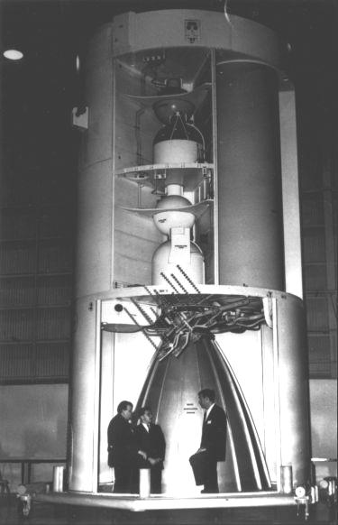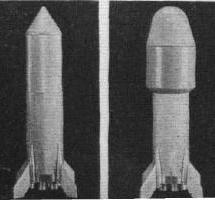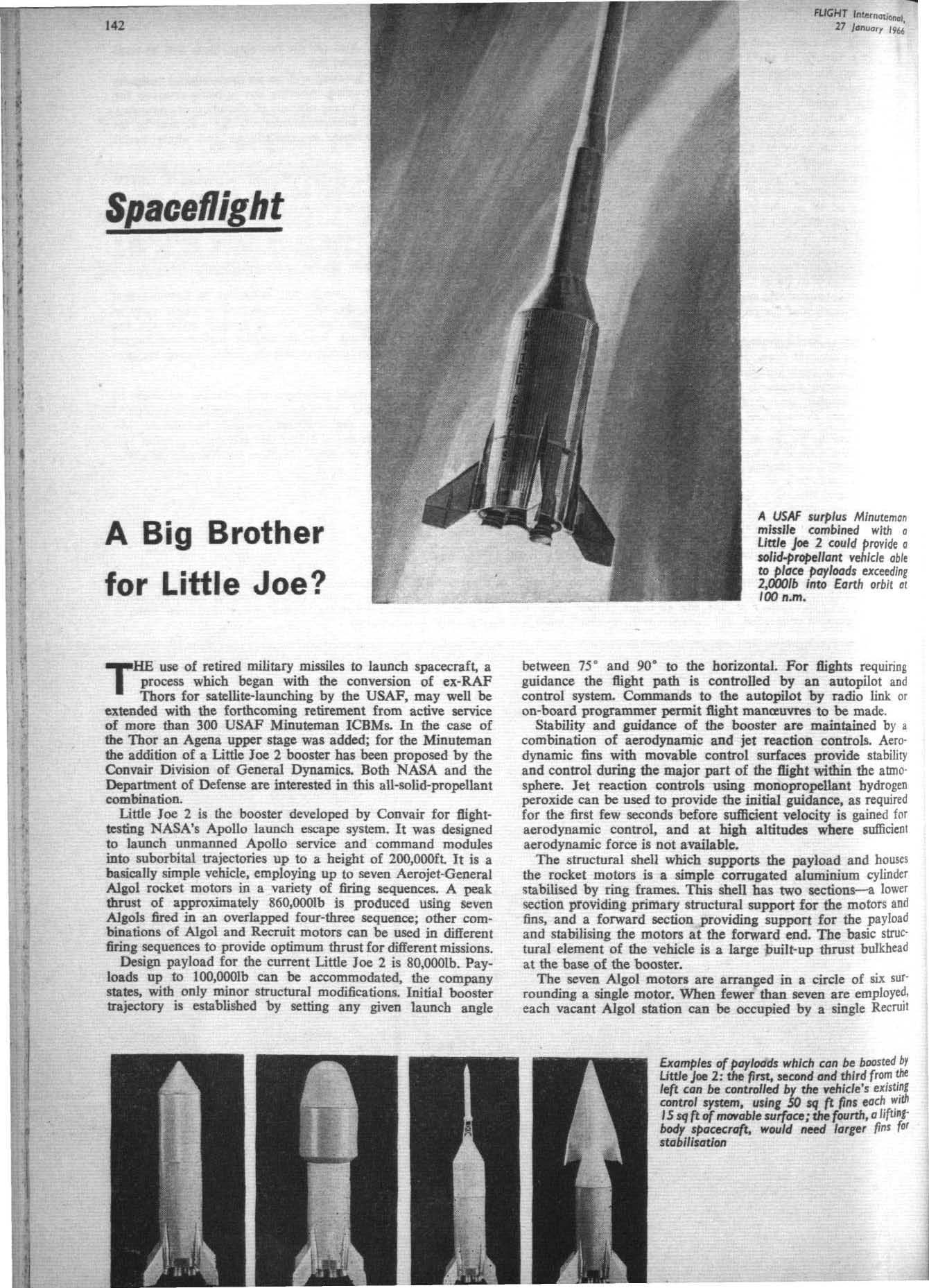 | Other Little Joe-II's Two issues of Flight International Magazine had articles on proposed variants of the Little Joe-II. The first (Dec 2, 1965) was for adding a Minuteman Missile as upper stages to put paylaods in orbit. The page at right was obtained from this web page, second from top. A later article, January 26 1966 (found on this page) covered many of the other proposals. The article does not specifically mention some of the proposals shown in four photos of models, which seem to be sub-orbital. The first seems to be for a very large payload launching version. The second shows a Lunar Module boost version. There is more on that below this page. The third model might be of one to carry a functional Service Module, to do a Service Module Abort test. The fourth model is for testing the X-20/Dyna-Soar abort capabilities during boost. Below, found on the web, a mock-up cut-away Service Module held up on a cylindrical section at the height necessary to clear the nozzle. Had a Little Joe-II been flown with a live SM, it would have needed an adapter ring tall enough to clear the SM nozzle, as seen with this one. ![]() Back to top |