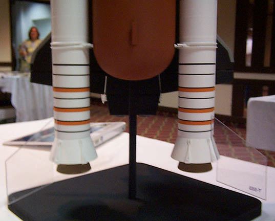 The whole model never was together until minutes before taking it to turn-in Monday night. Ed LaCroix brought in the neat display stand he made up, freshly painted black. The build-up process began with putting the ET onto the stand, then the SRB's, then the ET nose, and finally the orbiter. The Flights As some of you know, the first flight did not go well. It took off OK, flight path was OK, even sepped the SRB's OK. But from there things went badly. There were about 3 separate problems on the first flight it seems, and of course none had cropped up before in the 9 previous flights of the 1998 version boilerplate the NARAM model is based on. First was the ET nose came off shortly after the flight computer commanded SRB sep. The ET nose had been a bit loose and now I know it was too loose. That is a major problem for this since the ET nose has 6 wires connected to the main ET by means of a 6-conductor telephone jack/plug set, and when the nose came off it no longer could "see" orbiter sep that the computer uses as a key event to fire the ejection 1 second later. But the programming is supposed to fire the ejection if the orbiter is "late" in separating, there's a 4 second window from computer-commanded SRB sep to sep the orbiter by R/C. I do not know at the moment if the programming did not account for that condition or something as basic as the computer battery also going out about that time. So in any case it was fortunate that at least the ET main chutes got yanked out, since all the chutes are stored tightly in about 4" of space in a BT-80 in the ET nose (chutes meant to be blown out rearward by a piston when an electronic ejection charge goes off). And it seems the ET nose chutes got out (?) but didn't deploy, which if that was the case is a totally separate and screwy problem if both were out and both failed to deploy. Again, have to check video footage. The last goofy thing was that the orbiter didn't sep when commanded by R/C. I later found there was a problem in the programming I did in the computer transmitter where the transmitter's landing gear switch position affected the throw of the sep servo, I didn't realize the gear switch was in the chain of the programming (in other words I had needed to disable the gear switch from a default setting and overlooked it). To do the actual separation I flip a different switch, a boost/glide master switch, which is programmed to not only sep the orbiter but to change values for throws and to change the elevator trim for "uptrim" for glide). Considering that the orbiter never sepped, and it is not known yet why the computer didn't cause ejection once the allowed orbiter sep window expired, it might have been fortunate after all that the ET nose came off and at least got the ET main chutes out. If the ET and orbiter had plummeted down, there would have been little more than two SRB's left from that model. The ET main's chutes were not meant to bring the ET and 240 gram orbiter down together at the same time, so not only was the landing rough on the ET, bashing in the vac-formed aft dome, but also rough on the orbiter (which of course was not intended to "back into" the ground). The body flap was knocked off, one OMS pod popped off, one of the main engines was damaged, and a balsa spar inside the vertical tail (rudder assembly ) was cracked. Also one of the elevons was bent upwards by 10 degrees, fortunately it was possible to bend it back (The brass rod used as a torque rod on that elevon was bent). Jay Marsh and I set about doing repairs. There were a few moments during the attempt to get it ready to fly again that it looked like it might be "game over". Foremost was the flight computer. It was not responding at all, and considering the ET nose had crashed then it was looking like the computer was damaged. Jay carefully checked it over to try to pinpoint the problem. Fortunately it turned out to be that the 50 mAh 9.6 volt nicad pack was bad, one of the solder tabs must have broken loose when the ET nose hit. Fortunately there was a back-up wiring harness to plug in series two 4.8 volt 50 mAh packs as used for R/C RBG's. So, the computer "took a licking but kept on ticking" (didn't hurt that it was mounted inside a hardened "capsule"). Also for awhile the aft launch lug was missing (not known if it came off at launch or landing). The model is C-rail launched and has to have two lugs. If it had not been found then then it was likely the remaining upper lug would have been cut two halves and gluing one of the halves to the bottom. Good thing it didn't come to that. The ET/Orbiter attachments were also of concern. The two 1/16" brass pins that go perpendicular from the ET aft struts inside the orbiter to transfer the acceleration (push) loads to the orbiter were broken away forward, the cast struts had cracked along the 1/16" holes the pins were mounted into. Fortunately those were fixable by applying thick CA. Various other repairs to other pieces too, mostly minor. It was at least fortunate that no key part was damaged, or damaged beyond repair - there are some pieces where there is no practical field repair possible if they break, like an aft SRB/ET attach strut....."game over". Finally it was all fixed and ready to fly again. It pitched a little bit off-vertical but not too badly, and shortly after burnout the computer sepped the SRB's. OK, that's where flight 1 stopped going well. This time, ET nose stayed on, and the orbiter/ET coasted along for about 2 seconds then I commanded orbiter sep and it came off cleanly, right into a glide (unlike the 1998 boilerplate, this one was not built to "stage" by firing an A3 in the orbiter at orbiter sep). Now glide was the part of the flight that was a big question in the previous months. There never was any opportunity to check the glide trim of that new orbiter (Well, if I'd really wanted to I would, but it's too big a risk to do with a "real" scale model) . The best that could be done was to try 