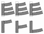 SRB nose roll patterns were drawn out as a generic "E" type shape useful for all three markings. | "Multiple E" patterns printed onto a sheet of paper, then paper rubber cemented to black decal sheet. Decals cut out to the needed marking type, paper peeled off, and marking applied to proper place on the SRB nose (frustum) |