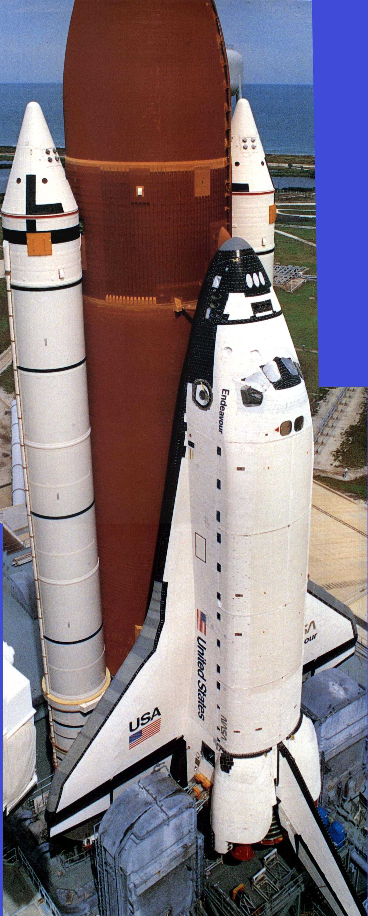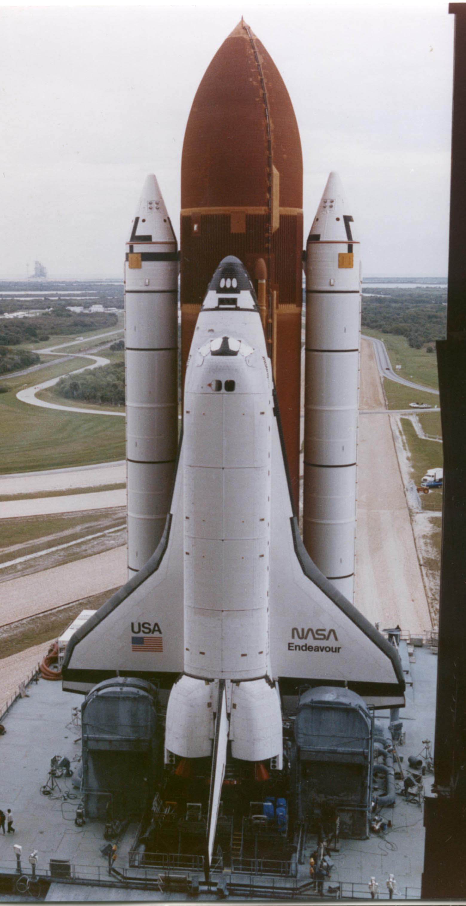 | STS-49 As always there are minor differences on ET's and even SRB's. Particularly the placement and use of insta-foam (lighter color orange or even yellow) on portions of the ET and even SRB's Also, some details of the same mission as-seen on rollout are different by the time of liftoff. Some tiles are left out for servicing work on the pad, including opening and closing of the bay doors. | 15S92-34865_STS-49.jpg | Endeavour_2_m.jpg | Endeavour_2.jpg |