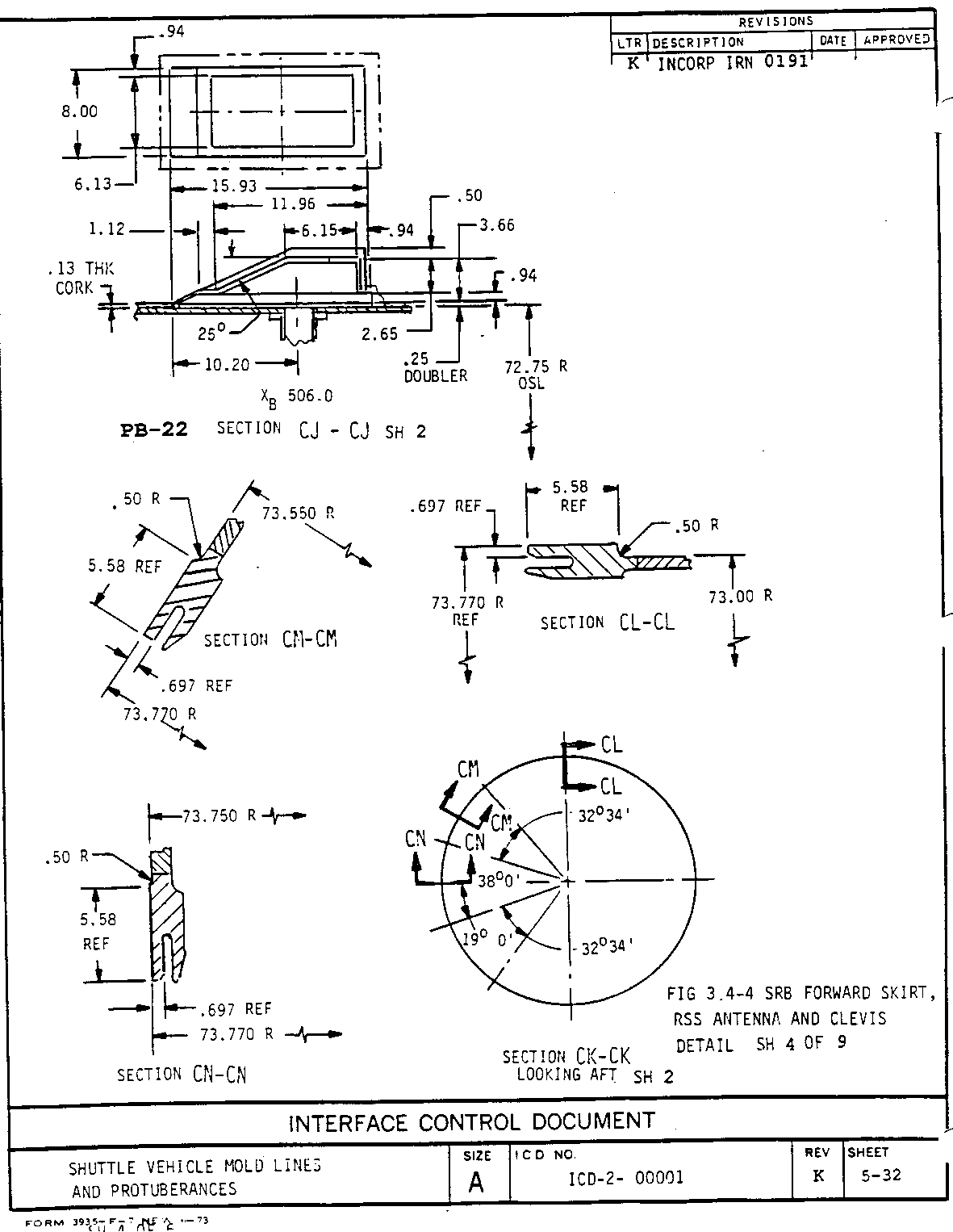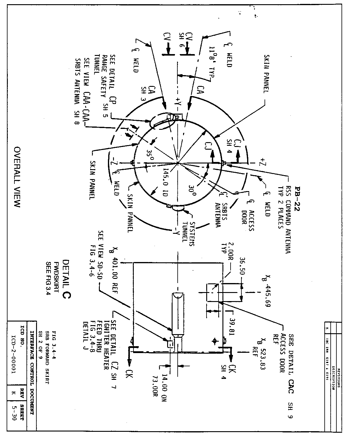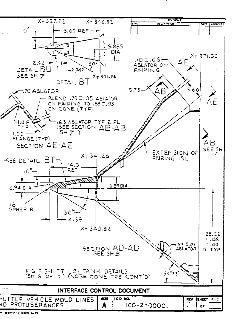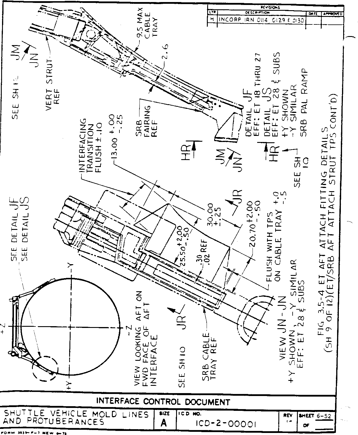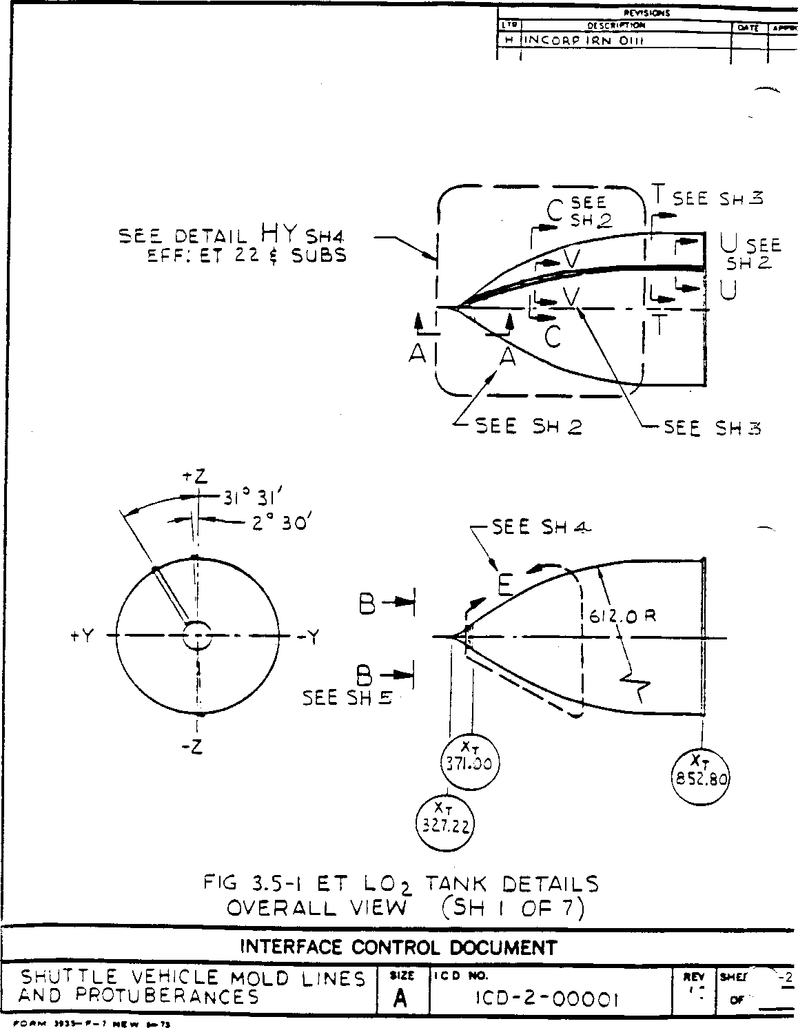 | ICD stands for Interface Control Document. It defines the external surface of a launch vehicle. Jimmy Williams obtained an ICD with a great deal of information on the shuttle ET and SRB's. Most of the drawings here are scans from that ICD. There are still many pages from that ICD which have not been scanned yet. Most of these are from ICD-2-00001 "Shuttle Vehicle Mold Lines and Protuberances" 7/31/91 A few other pages are from a Rockwell ICD defining portions of the orbiter. |
