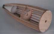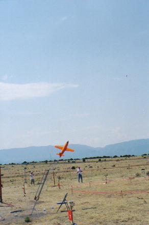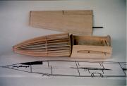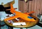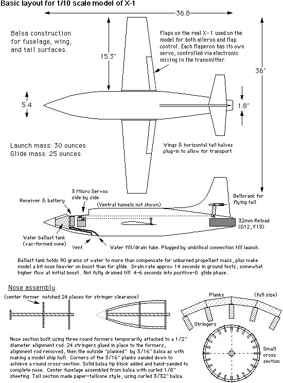 | What follows is a description of the building and the flying of the model. See also the assembly drawing which is on this web page and the pictures of the nose assembly and fuselage subassemblies above. The X-1 model has a scale factor of 1/10. Diameter of 5.4", length of 37", span of 36", Wings just a bit bigger than scale, for a wing area around 165 sq in (150 would have been scale). All-wood construction. Nose section built-up using round formers and 24 stringers, with 24 3/16" balsa "planks" glued across the stringers. The 24-facet cross-section was sanded to a round cross-section. Center fuselage also built up, but a very simple frame with bulkheads, skinned by 1/8" balsa curled to shape. Rear section was a straight cone made up of 3/32" balsa curled similar to how paper & cardboard transitions are made. Some 3/16" balsa was glued inside the lip of the slightly oversized large end of the tailcone so when sanded down there was a 2" curved transition instead of a sharp break. Not quite the right rear fuselage shape, but practical and light. Wing was also based on balsa construction, with 1/16" wing skins, and using a Bob Parks BP-3d airfoil. The wing had a 5.75" span center section that glued into the fuselage mid-section, the outer panels of the wing plugging into the center section using telescoping fiberglass tube joiners and music wire alignment pins. Wing control surfaces consist of what were flaps on the real X-1 (going out about half-span from the root). On the model, those flaps were used as flaperons, moving both as flaps and as ailerons. More recently the flap capability has been taken out, they act only as ailerons. The horizontal tail section was built to be all-moving, a "flying tail". That simplified making the tail removeable for transport, slipping the two halves and their joiner rods from the bellcrank inside thehollow fin/rudder assembly. Power by 32mm reloadable motor, as used by the Aerotech "Phoenix" Rocket Boosted Glider. For G12 and F13 power. Might do an F16J someday but the endburners are more my speed. The burnoff of the propellant would cause a VERY significant shift in the CG due to the far aft locaiton. To compensate for this, a vac-formed water ballast tank was added as far up front as possible. It held 90 grams of water. With a fill/drain line and a vent line. At liftoff the drain line came unplugged to allow the water to drain out by gravity-feed. Tank is fully drained about 4-6 seconds into positive-G glide after a G12 reload. Final details of the model were that the upper and lower ventral system tunnels were made out of vac-formed plastic. The finish of the model was primarily by using orange Towerkote iron-on covering. The lower ventral tunnel was painted using a color-matched paint by Monokote. I wish I'd painted the upper tunnel too, as the Towerkote produced some bubbles that would not go away. The big Stars & Bars markings were mostly cut-out trim monokote, plus some red decal stripes that Ed Lacroix added. The decals for "Glamorous Glennis", "Bell Aircraft", and a few other markings were done in MacDraw (much traced from scans of X-1 kit decals Alex Seltsikas did for me) and color printed. The color print then was used as a master in a color xerox machine to print onto some high quality clear water-decal film tom Campbell gave me info on (From Micro-Mark). Obtaining the decal material and printing them was described in more detail earlier this week in the thread about how to make decals. The model's mass turned out to be around 30 ounces in liftoff mode on a G12, 25 ounces for glide (5 ounces lost by water dump and propellant burnoff). Now, when I planned building this a few months ago, it was going to be "for fun", to sport fly at NARAM. But part of the way through building it, I started to think about entering it in sport scale at NARAM. It actually was a dumb thing to do if our team wanted to score well, the Little Joe II has a good track record, while the X-1 would not score well in static. But in helping to run NARAM this year, our team wasn't flying as "seriously" as we usually do. Ed LaCroix agreed it seemed like a neat thing to do this year, so we decided to use that for Southern Neutron's sport scale model after all. Indeed it didn't score up there in static, 5th place. On to the flying. Ed LaCroix assisted getting the bird ready to fly from the tower, as we loaded the water ballast, plugged in the battery pack, and popped the canopy in place. At launch it took off out of the tower straight. But it had a bit more up trim than it should have, it pitched up near vertical and I had to use full down to keep it from going beyond vertical onto its back. It also had a roll that I let go while working the pitch control . Finally settled down into a glide, as it stalled somewhat due to the trim still being off. Got it sort of trimmed, and also trimmed out a roll to one side. Finally ready to land, trying to land on a real dirt runway at the NARAM site. Coming in just fine, then put the flaps down and... it pulled to the left. The flaps didn't deploy symmetrically. Landed safely, but missed the runway. OK, so it was planned to be one flight. But that flight wasn't satisfying. So, quickly it was ready to fly again. This time with downtrim added, and aileron throw reduced (it had been sensitive in roll on glide). The launch was very smooth, as though on rails. Pulled a bit of up to bring the final climb angle ot around 60 degrees, and corrected a bit of roll. So it was a very smooth easily controlled boost. Altitude was around 500 feet. Never even felt the difference when the last bit of water ballast drained out, it felt good in glide off the bat. Still a bit sensitive still in roll during glide, so I went back to the boost low rate for aileron throw. Did at least one very large racetrack pattern, maybe two, before going to the far end of the runway to set up for landing. Got there with lots of altitude, so did a couple of 360's to burn it off,