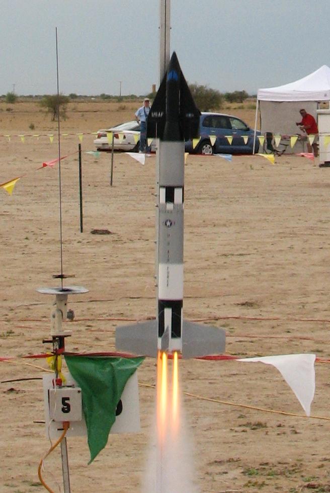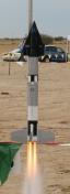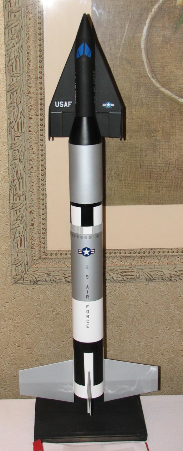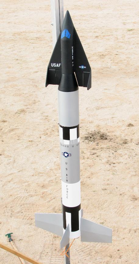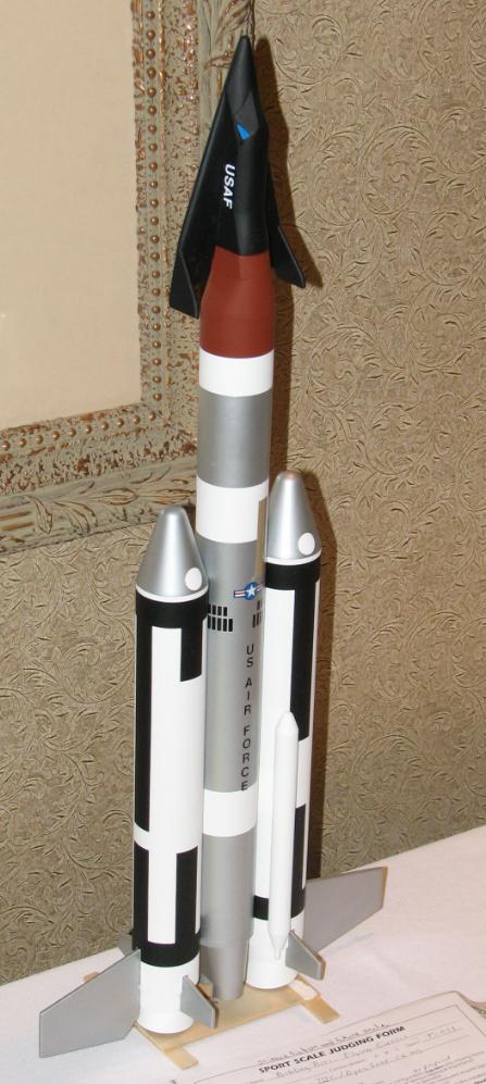 | Built May, 1999 Scale model built for the Future/Fiction (F/F) Sport scale event, flown at the Mick Wilkins Memorial Scale Meet at NSL-99. This is one of many proposed versions of the X-20 Dyna-Soar, in this case to have been launched atop a Titan-II booster. The outline drawing by Dan Joyce showed an X-20 looking a bit simpler than the later version people are more familiar with. That outline drawing also showed the windscreen, no jettisonable cover was indicated. The colors and markings were extrapolated from a combination of a crude artists conception but mostly based on the pattern of the Gemini-Titan, with appropriate use of US Air Force insignia and lettering. Model is scaled at about 1/46 scale, a BT-80 (2.6") diameter body, 32.6" long. To make it fly stably and straight, it used 6 ounces of noseweight to make it balance ahead of the 1st stage/2nd stage interface. See model assembly drawing at bottom. In case of nose up or nose down lift by the X-20, which would have made the model tend to loop, the fins were angled slightly to make the model roll. This was proven out first by building a smaller scale BT-50 boilerplate with a very crude non-gliding X-20, and deriving a worst-case CP using Tom Beach's CP portion of his Rocket Stacks to determine how much noseweight to use. The boilerplate flew straight up, no problem. X-20 was built out of balsa sheet. The outline was cut for the bottom fuselage out of 1/8" balsa and vertical formers glued into place. Light and easily curled 3/32" balsa was used to make up the fuselage sides and top. The nose section was done in a similar manner, two sets of curved balsa sheeting to match the two different slope angles, as well as a solid tip sanded to shape. Holes in the formers allow for the X-20 to fit atop a BT-20 extending from the Titan adapter section. The X-20 was built for the elevons to pop up for glide, held down flat by the BT-20. For a finish, the X-20 was covered in black Towerkote (goes well around curves) and sprayed clear flat after decaling. The adapter was built from .02" plastic sheet. Complicated cross-section change from the fuselage of the X-20 to the round body of the Titan. Location of X-20 centerline compared to Titan body also makes the adapter eccentrically off-center. See the drawing at below right. Noseweight added to the BT-20 to extend the noseweight as far forward as possible. Titan body made from BT-80, actually Totally Tubular's 34" long BT-80. Separation point just ahead of the top black roll pattern. Fins built up from .02" plastic. Markings - The X-20 US Air Force and USAF white lettering was made by Tango Papa decals. Stars and bars on the wing and Titan taken from old kit decals. US Air Force black lettering and simulated rectangular/semi-oval openings were homemade decals, clear sheet run thru a photocopier. The simulated opening wraparound decal however had some flaws, the toner started to flake off a bit. Black roll markings were a problem. I normally use Microscale's black solid color sheet, but they no longer make them and this model wasn't important enough to justify using what little I have left. I used some old Sig solid color black decal, but it was fragile and 2/3's of the rectangles cut out cracked or tore. But finally they were done. But after drying they dried with wrinkles in many spots. The "coup de grace" for a string of finishing problems was in applying the clear flat coat to the Titan. The clear flat I wanted to use (Model Master) happened to attack the aluminum paint used (fortunately I tested it first). And Krylon's clear flat made decals stand out terribly, they made the clear film look a bit frosty. So I used Microscale's clear flat, which comes in bottles and needs to be airbrushed on. Unfortunately I didn't test that (why, I don't know). It seemed to be OK but after awhile some white specks showed up, some of the clear flat had "spit" out and made the specks show up. Tried to clean it off, it's water-based, but it had dried too much to clean off and just smeared. I've never had a model go through so many problems in the painting/finishing phase. The flight was on an E15-4, launched from a 6' C-rail. I let it fly at a bit of an angle into the wind for concern of how much it would drift downwind, as there were trees about 400 feet downwind. But it weathercocked a pretty good bit too, and it rolled quickly, needed only about half the roll angle in the fins. The weathercocking caused it to be pretty close to the ground at ejection (under 100 feet?), but the recovery system held up OK (twin chutes on the main body and twin chutes on the heavy nose section, each chute with its own 6' long 1/4" elastic shock cord). The X-20 came off, did a couple of stalls, and settled down into a quick glide. Took second place in team division at the Mick Wilkins meet, beaten by one point! Ahhhhhh! NARAM-48 update (2006) One of the events for NARAM-48 was Future/Fiction Scale. So, the X-20 Titan model from 1999 was upgraded. A new Titan-II body was made, to solve various shortcomings of the orginal, including the finishing problems. Also, the single engine mount for an E15 was changed to two 24mm mounts for a twin D12 cluster. The model was flown for the Southern Neutron Team The model was in 4th place in static judging, at 685 points. The leading Team Div. model at 730 points was the Bumbling Brothers Team (Bob & Peter Alway), who also had an X-20 but the Titan-III version. The flying made the difference. The took off nicely, boosted well, ejected near apogee, and had good chute deployment. The X-20 glided great (for an X-20). It scored 200 flght points, to move from 4th to first. Among the mission points it scored were glide, two-engine cluster, and "tracking radar beacon" (Walston tracking transmitter). The Bumbling Bothers Team (Alway Brothers) model did not have a glide capability. | Photo by Greg Warren