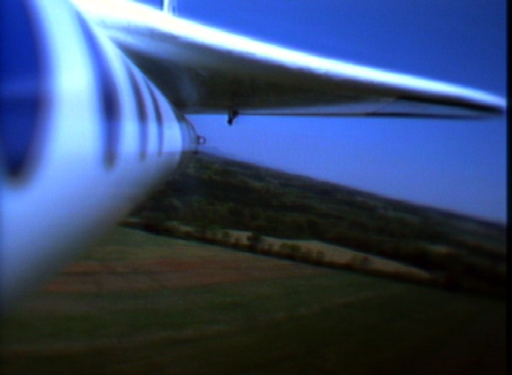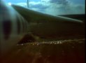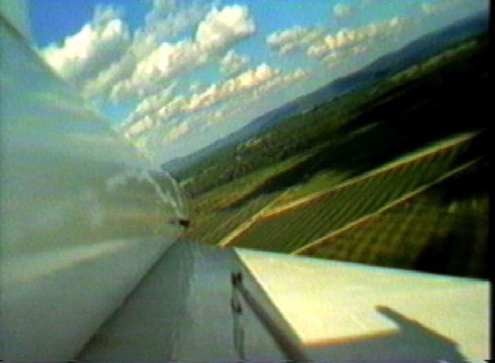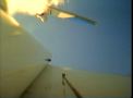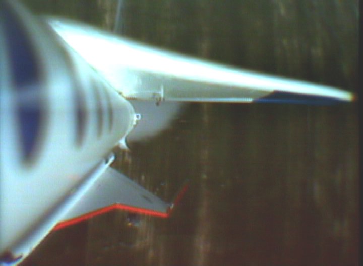 I got to see the last part of the SkyDart as Todd flew it. It wasn't exactly the sort of model he'd flown before but he was adapting to it. His piloting chore was made a lot harder, as it was later found that one of the elevons was moving more than the other elevon (very bad for any delta-wing type model), something happened between its solo flight on Saturday and the Orbital Skydart flight Sunday. At the last moment the model was coming close to the large long wheeled mobile sprinkler assembly (the site was a large sod farm), he tried to avoid it which resulted in them model hitting the ground at an angle. Fortunately there was little damage, mostly cosmetic (It flew solo again at the Birmingham Blast Off on May 21st). Both videos recorded successfully. Though there were some signal dropouts from the SkyDart during glide. The SkyDart pitched up pretty fast when it separated, so neither model's camera saw the other model for long, just enough for a frame grab. From the SkyDart's camera, it was seen that the model rolled quite a lot during the boost, it was supposed to be well-trimmed based on an E6 flight the SkyDart made by itself on Saturday, but something happened from then to Sunday'sOrbital SkyDart flight. In the SkyBooster video, looking forward, the two right side launch tower rails can be seen, especially the one nestled between the top of the wing and the body tube. The little green flag seen flapping around is attached to a "stopper" on a piece of surgical tubing which is used for filling the water ballast tank. The stopper and tubing are attached to an external umbilical on the tower assembly, which disengages at liftoff to let the water start dumping out (the water in the nose is to compensate for the propellant mass of the two G12's. See the X-1 page for more info on the water ballast method). This photo and this photo from the Orbital SkyDart Project page shows more on the water umbilical A surprise seen in both videos, especially the SkyBooster's, is how the water ballast that is dumped from liftoff, flowed onto the top of the wing and part of the body tube. The dump port is at the "bottom" of the nose cone (glide orientation), but then the wing top is tangent to that side of the tube so maybe it's not such a surprise that much water runs that way. After transition to glide, some of the water can be seen flowing nearly parallel to the leading edge of the highly swept forward portion of the double-delta wing. Also, when the SkyBooster goes into that deep stall,, the airflow noise suddenly gets scarily quiet (considering the airflow noise the rest of the time), then "plop" it lands and skids to a stop. The SkyDart video is 320 x 230 resolution, a 5.4 Quicktime movie The SkyBooster video is 320 x 230 resolution, a 4.3 meg Quicktime movie |