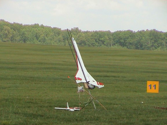 After quite some time in prepping and getting all the video up and running, the model was finally ready to launch. The two G12's ignited well in the SkyBooster, and the model took off with a nice climb rate, easy to correct on boost. At 6.5 seconds into the 8 second burn, I flipped the switch to ignite the E9 in the SkyDart. Unlike the E6 air-starts of NARAM-46, the E9 ignition was VERY obvious when the white smoke appeared, and the higher thrust made the SkyDart separate from the SkyBooster right away. I got to see a bit of the SkyDart's flying but had to concentrate on flying the SkyBooster. It was somewhat tail-heavy, making it tricky to fly. I tried to set up a downwind leg to do a 180 to turn into the wind but it lost a lot of altitude so I had to forget doing a 180 and had to do a downwind landing. It got into a large stall about 30 feet off the ground, fortunately holding full up allowed it to keep the nose up so it was level when it landed. Fortunately it suffered no damage. Either I have to add some noseweight to it or arrange for moving the R/C battery pack from the mid-fuselage top hatch to near the nose cone.