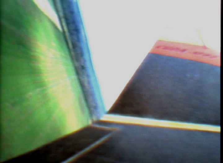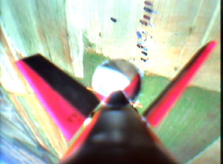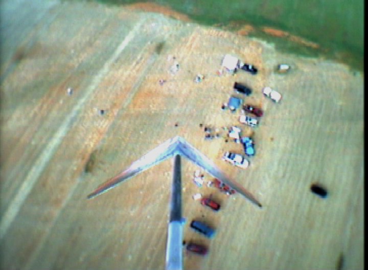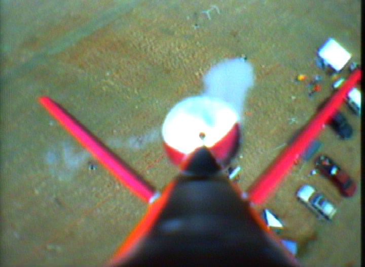 A big surprise in reviewing the video was that for a very brief time on boost, the camera pod rotated about 90 degrees, then rotated back to a rear view. Strange. I noticed on a few occasions in other boosts where the tailboom seemed to move a bit from left to right, that probably was the camera pod mount rotating a tiny bit. It also seemed to occur a bit during some forward looking parts of the glide, when pulling high speeds or dives. Some tweaking of the rotating pod system seems to be in order. The video shows from lifotff to landing, with some sections cut out for time, 240 x 170 resolution, a 1.7 meg Quicktime movie | |