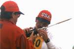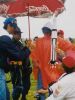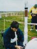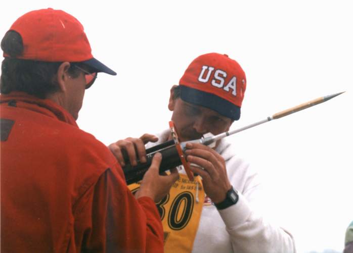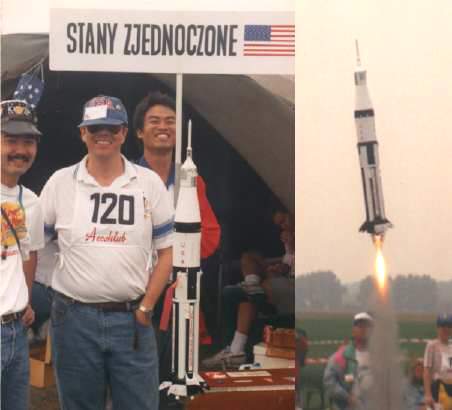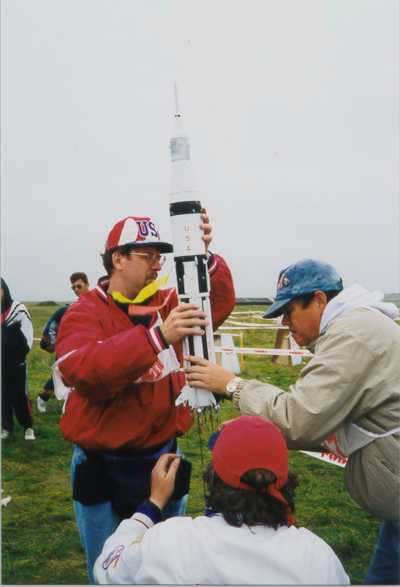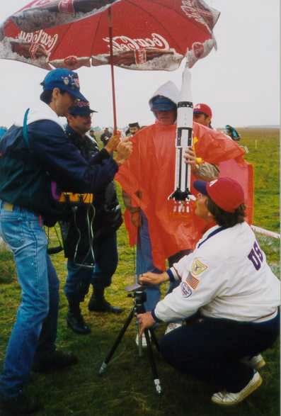 | FAI Scale (S7) FAI Scale involves documentation data that includes dimensions and photographs of details. The models are measured and judged for accuracy, difficulty, and workmanship. In S7 (scale), extra points are given for the flight including clusters, staging, R/C, etc. In S5 (Scale Atltiude), the altitude is added to the static judging score. For more on FAI go to the USA Spacemodeling page  | |  Multiple Champion Bob Biedron's Silver medal Ariane (S7) at 1996 WSMC in Slovenia. Boost on E30 & 6 A's with R/C ignition of 2nd and 3rd stages (pop-out fins). Also shown, George Reibeshl and Dave O'Bryan (Click on pic) | To S7 Page on USA Spacemodeling |