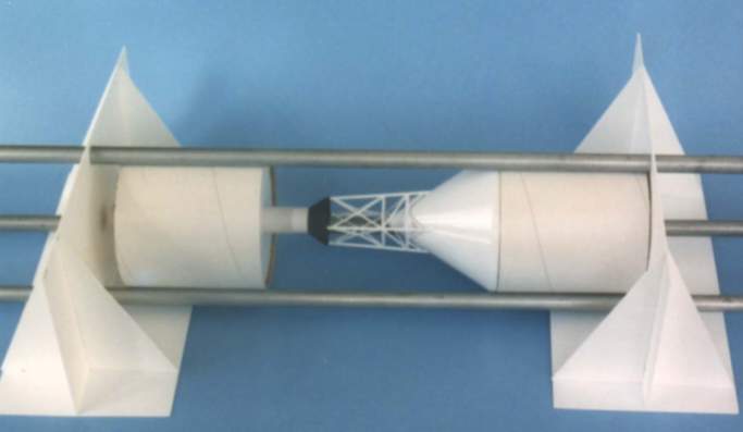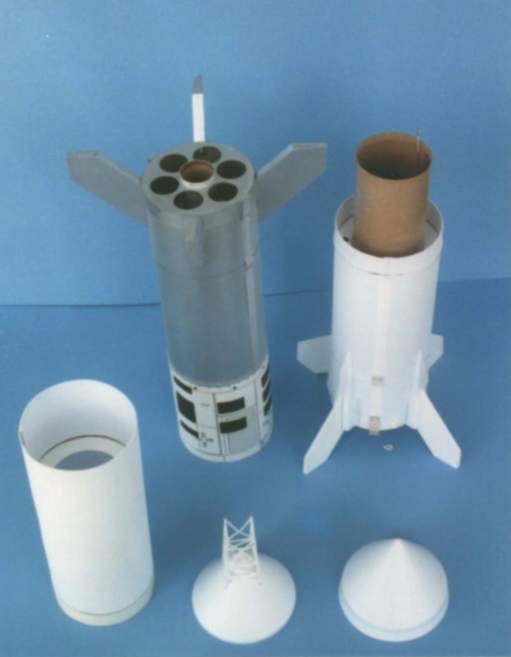 | | Assembly pictures (1990) - click to see larger image, return button to get back 1 - Boilerplate model was built to explore the construction using corrugated plastic sheet curled into a tube, fin attachment, and BT-80 tube for recovery compartment (with a printed wrapper for the Service module pattern). Service Module slips on and is replaceable, "Regional" Little Joe model (being built in these pics) has gone thru at least 4 Service Modules due to accumulated wear and tear. Much use of vacuformed parts, including the BPC/Capsule cone , nozzles, and fin root fairings. 2- The scale of 1/39.5 was determined by a12" wide piece of Evergreen "Metal Siding" plastic sheet with .10" spacing to produce the necessary 120 corrugations (result is 3.89" diameter tube). Much use of vacuformed parts, including the BPC/Capsule cone , nozzles, and fin root fairings. Little use of casting due to not discovering the joys of Alumilite by then - the cast fairing translucent pieces on the system tunnel plate are polyester resin, not recommended these days. 3- Tower built from 3/32" and 1/16" plastic tubing using a jig to hold two vertical struts and the horizontal struts (jig not shown). Alignment of tower top to cone, and alignment for attaching LES motor and skirt was done by making a special jig (shown) to hold all parts centered. When in doubt... "get jiggy with it".... |