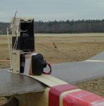 | Flight #4 was on an E6 reload. Full power, 8 second burn. Shortly after liftoff, the camera cut out for a brief period, either the picture or the signal, so a lot of the E6 boost was lost. The mirror didn't rotate completely at first, but later during the glide it did move some more. | |