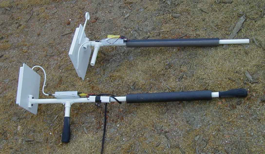 | Flights at the February Birmingham Rocket Boys Launch, at the Phoenix Turf Sod Farm. A Cuda-Flap model made in 2001 for the FAI S8-P event, for "Precision Landings", was brought out of mothballs (It had been superseded by the Stingray-Flap models Phil Barnes made with Dave O'Bryan in 2002). The Cuda Flap model was flown at the January launch on staged C6's, to see how well it worked out. It was OK, at least C6's are available, but Aerotech may be making the R/C reloads again this year. To use the Gearcam aboard the Cuda-Flap model, a special mount assembly was made out of 1/32" plywood. It was made to mount the camera looking "up" as seen in glide. A pivoting mirror set up above the lens at nearly 45 degrees to look to the back for boost, and then rotate to nearly 45 degrees forward for glide (Biased to look a bit down). The assembly was made to be temporarily attached to the glider by using vinyl tape at front and the wing bolt at the rear. The Cuda fuselage was modified a bit to allow for a short pushrod to extend a bit out of the side of the fuselage, so it would retract when the flap was briefly deployed. When it retracted, it would release a thread that holds the mirror looking to the rear, allowing a rubber band to flip the mirror to the front. I had wanted to use the 9 volt battery to power both the camera and the R/C gear (by using a 7805 regulator). But it turned out that when sharing the same power source, the camera picture was affected very badly any time a servo was moved. So, the model had to fly using its normal 50 mAh Nicad pack for R/c, plus the 9v battery externally. The battery was 37 grams, camera mount/mirror/wiring assembly 15 grams, and the camera 10 grams. So, 62 more grams for a model that has a 204 gram glide weight with a burned out E6 reload in it (266 gram glide weight with the Gearcam stuff aboard). At the launch, Ron Witherspoon manned my high-gain 14db receiver antenna assembly for some of the flights. Steward Jones used his own Gearcam receiving equipment, hi-gain antenna, and digital video camera to record some of my Gearcam flights, for others he used his digital video camera to get ground-based footage of the flights. Steward & I made our own versions of hi-gain antenna pointers using 1/2" PVC pipe and PVC fittings, as seen below.