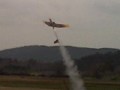 | Flight #1 - However, it almost didn't get a chance to show how well it boosted or glided. On the first flight, using staged C6's, it pitched up and got out of control. Unlike most R/C RBG's, the Cuda-Flap model's thrustline produces a little bit of up pitch on boost, rather than down pitch. Also, with the engine mount behind the CG, flying it staged means it is particularly tail heavy at liftoff, so it is more touchy until it stages. I had made some modification to the transmitter programming the night before, and somehow the boost mode/glide mode switch got it's programming reversed. So, the model took off with significant up elevator trim (meant for glide), and the servos were at high rate (meant for glide) rather than boost elevator trim and low rate. It ended up doing a loop, missing the ground by about 20 feet or so. In the February videos, it had been surprising to see how much the tailboom twisted. Well, on this flight the tailboom twisted incredibly for a few moments. After the boost ended it was hard to get the model trimmed out, as I was trying to adjust glide trim while the transmitter switch reversal meant that the "up trim" for glide was not enabled. I did finally realize that for whatever reason the up trim for glide was enabled with the switch in boost mode, so left it there and finally landed it safely. The video is of the boost only, 320 x 230 resolution, a 1.1 meg Quicktime movie | ![]() Tailboom twist during loop |