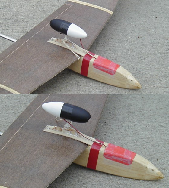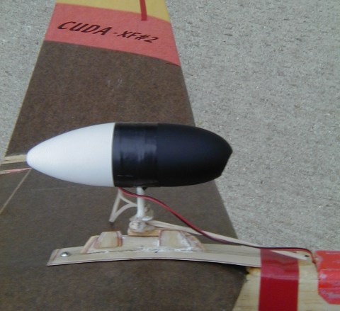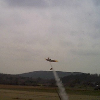| Flight #2 -After sorting through things in the transmitter, the second flight was made on a single C6. I didn't run video, flew it using a 50 mAh Nicad pack for R/C only, to save the Li-Poly packs' charges for later flights. The flight boosted fine, and after sorting out the trims on the transmitter it was realized the bird was actually a hair tail heavy, so a bit of clay was added to the nose for the rest of the flights. | |