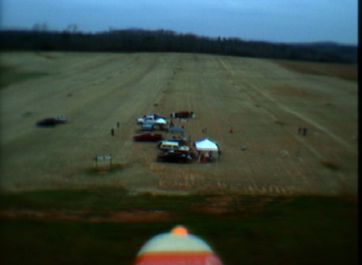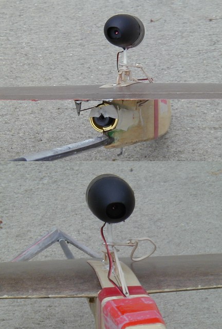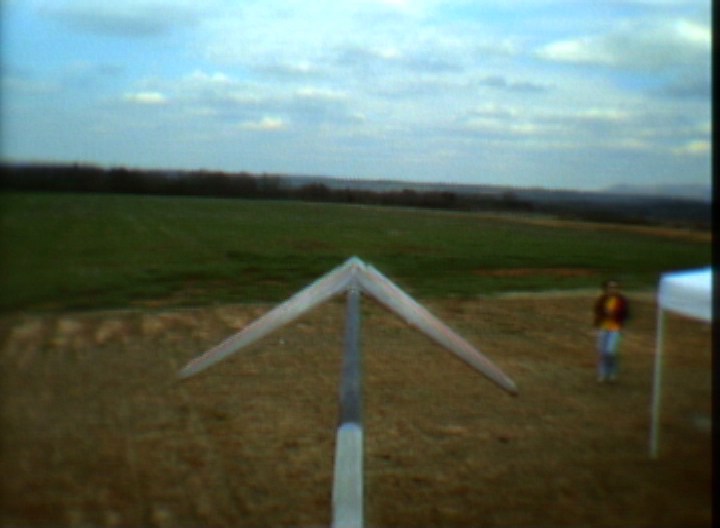 A big surprise in reviewing the video was that for a very brief time on boost, the camera pod rotated about 90 degrees, then rotated back to a rear view. Strange. I noticed on a few occasions in other boosts where the tailboom seemed to move a bit from left to right, that probably was the camera pod mount rotating a tiny bit. It also seemed to occur a bit during some forward looking parts of the glide, when pulling high speeds or dives. Some tweaking of the rotating pod system seems to be in order. The video shows from lifotff to landing, with some sections cut out for time, 240 x 170 resolution, a 1.7 meg Quicktime movie | |