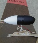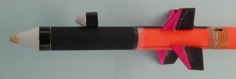 | Two Sunguidance flights were made. Now, Sunguidance does not need the sun, in overcast skies the model will fly generally straight up, biased a bit towards a brighter part of the sky. But I wanted for the sun to be out to get the desired flight paths. Fortunately, the sun did break though on several occasions, though at varying intensity due to haze. The Sunguidance flight at the SEARS launch was overcontrolled, the model zig-zagged back and forth very quickly. That was partly due to larger nose control fins, so a new set was made that was the size of the most commonly flown previous fin sets. But most importantly due to the Bertha type nose cone which had the sides nearly parallel where the photoresistor sensors are located. So, after only a few degrees or pitch or yaw, one side of the nose cone would get shaded and therefore drastically affect the movement of the nose section control fins. So, that was simply fixed by replacing the Bertha type nose cone with a Shuttle SRB type nose cone. That meant it would not track the sun quite as sharply as before, but well enough. It caused less movement of the control surfaces for given amount of error in degrees, so it would tend not to overcontrol . As would be shown in the flights and onboard video, the changes made the model fly a LOT smoother. | ![]() SRB type conical nose (camera removed) |