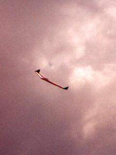 | A different kind of model, a Zagi flying wing. The Zagi is a 48" span R/C slope combat glider. This one was convertedto boost on rocket power, using F13 and G12 reloads. It is quite aerobatic, thanks to its use of full-span elevons. To find out more about the Zagi flying wing, go to the Trick R/C (Zagi) home page Photo courtesy of Ronny and Greg Tipps of Waverly, Tennessee.