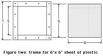 How to Build and Use Your Own Vacuum-Forming Device By George Gassaway Occasionally a model requires a special part or set of parts that are not commercially available, and is not practical to make light enough with conventional scratchbuilding methods. In some cases, the best answer would be to vacuum form parts if you had the means to do so. Now you can, with a crude homemade forming device that can be built in one night for as little as $20, depending on materials. It does require two appliances most people have, an oven and a vacuum cleaner. Due to the use of an oven for heating the plastic and the risk of fire if the oven is left unattended, this is recommended only for adult modelers or for use under adult supervision. Building the Vacuum Box: The Vacuum Box's purpose is to serve as a good interface between the plastic held in the holder frame and the vacuum from the vacuum cleaner. Therefore, the vacuum box can be just about any size and can be built from many different materials as long as certain criteria are met. I made the vacuum box from fiberboard, which is fairly cheap but is not easy to cut. Plastic is a good material to make most of the box from, as long as the top of the box is not plastic. The top needs to be some sort of heat resistant sturdy material that will not sag from the combined effects of the hot plastic in the frame and the vacuum itself. The vacuum box needs to have some supports under the top surface to keep the top surface from sagging while forming, the supports not interfering with the vacuum to any of the holes in the top of the box. The box must be airtight, except for the holes in the top surface and the side connection to the vacuum hose (the side connection can simply be a short piece of BT-55 or other tube that fits the hose). The top of the box can be made of pre-drilled perfboard from an electronics store (easy but expensive), or fiberboard/hardboard/plywood with holes you drill yourself (cheap but takes time). Your biggest decision will be in choosing what size to make the vacuum box, as it will determine the maximum size plastic you will be able to form. I chose to make a vacuum box two inches deep with top dimensions of 12" by 18" so that it could handle the largest plastic/frame combination that could fit into the oven, although so far the largest size frame used has been one 13" by 12" to hold a 12" by 11" sheet of plastic. Building the Holder Frame: The frame holds the plastic during heating and forming. There are different materials to use for the frame. Metal would be best for heat resistance, and modelers with the equipment and skills to do metal working may want to make the frame from metal. The frames can be made from 1/4" hardboard (such as Masonite) and cut out, or they can be constructed from materials such as spruce. I have made frames out of 1/8" thick spruce, each top and bottom frame using eight pieces (four atop four others, with the joints overlapping). An upper frame and lower frame is required, the plastic will be held between them. Holes will need to be drilled in equally spaced locations for the bolts and nuts which hold the frames together. It is best to tape the frames together so that the holes will be aligned properly, and make a mark on each frame to indicate how to align them once they have been apart. The best bolts to use are 6-32 with wing nuts to hold the frames together; the wing nuts make installing and removing the plastic much easier. Use cyanoacrylate type glue to permanently bond most of the bolts to the bottom frame, upside down with the threads sticking up. Do not glue bolts in place along one side however, so that they can be temporarily slipped out of place. This will allow you to more easily slide out leftover scrap plastic and slide in a new sheet from the side the bolts are removed from (this way, you don't have to remove and replace all those wingnuts every time you form a part). Since the heads of the bolts will protrude down from the bottom frame, add some strips of spruce along the bottom frame so that the bottom frame will meet flush with the top of the vacuum box for a fairly airtight seal. You will most likely find a need to make several different size frames to hold different sizes of plastic, depending on how large or how small the part to be formed is. Plastic sheets 4"x 4" can handle small nose cones (<1" dia and <2.5" long) and 6"x 6" plastic sheets for larger cones up to egg capsule halves. Some frame sizes will be dependent on the source for the plastic. Evergreen Scale Models plastic sheets are commonly 6" x 10.5", so a special size frame is needed to hold Evergreen plastic (for economy, it is good to make a smaller frame to hold a half sheet too, which is 6"x 5.25"). Once the size of the plastic sheet has been determined, plan out the size of the frame so that the bolts of the frame will be just outside the edges of the plastic sheet. For example, for a 6"x 6" sheet of plastic, the frame should be about 7"x 7" with 1/2" frame overlap beyond all edges of the plastic. There should also be about 1/2" of the frame gripping the plastic sheet. This would mean the frame would measure 7"x 7" on the outside and 5"x 5" on the inside, the frame itself having a one inch "wall thickness" all around. See figure #2. Other items: A holder needs to be made to hold the plastic and frame above the oven rack. This can be any heatproof material that can hold the frame 3-4" off of the rack. Sheet metal can be bent into a large "U" shape to hold the frame. The vacuum box has holes all over the top, but you may want to use a frame smaller than the area with the holes. To effectively cut off a vacuum leak through those holes outside of the frame area, cut out a mask from poster paper. The rectangular hole in the mask should be about 1-2" smaller than the frame inside dimensions, to allow a little leeway if the frame is not centered exactly during forming. The outside mask dimensions should be about the same a