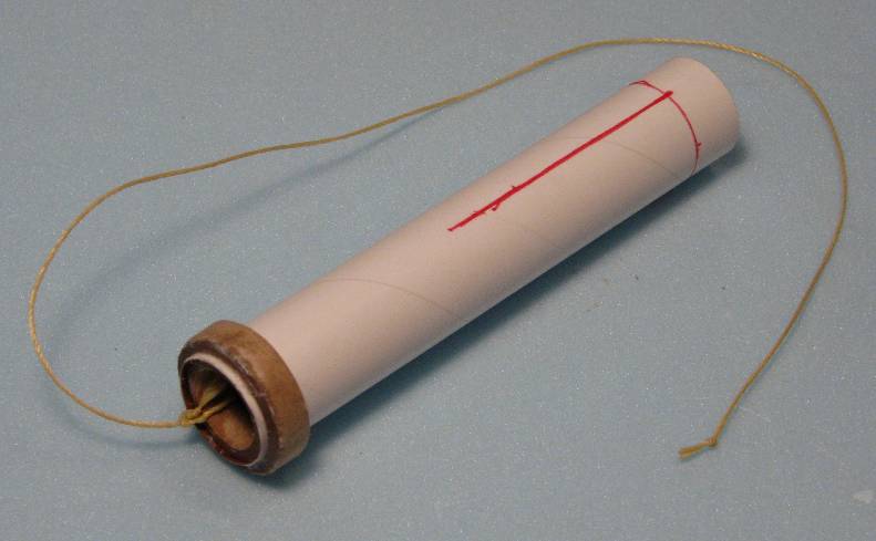 | BT-20 engine mount tube: Use the marking guide from the Plans to mark the location for the three fins, and mark those locations lengthwise on the tube, Tie the Kevlar Cord to small centering ring. Glue it inside of the tube. The large ring is a SNUG fit, and needs a bit of de-burring to get it to slide on. Glue it in place and let the assembly dry for awhile. | |