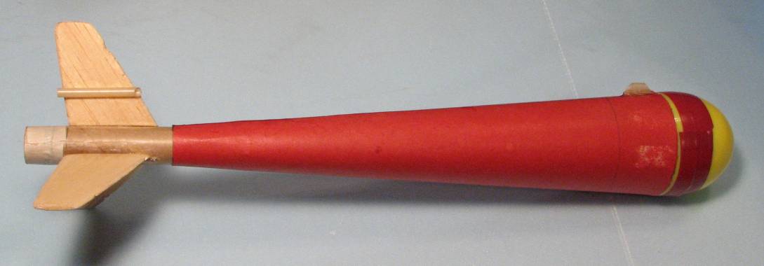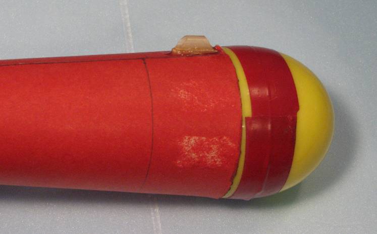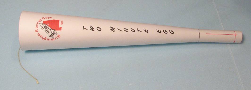 | Remaining steps: Drill two small 1/16 to 3/32" holes into the bottom of the egg capsule so you can attach a loop of strong cord securely to the capsule (I forgot to include some extra Kevlar cord for this in the kits). The REAL shock cord for the model is 1/8" elastic, about 3 feet of it. The short Kevlar cord attached to the main body is there as a good shock cord mounting system, nothing more. Tie the elastic to the kevlar to attach the main body. Tie the other end of the Elastic to the cord on the egg capsule. | |