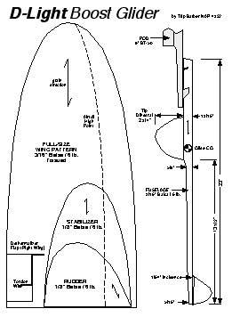 The D-Light wing is about 60 square inches of area with a 17.5inch span and an aspect ratio of 5.6. It uses a standard low-camberasymmetric airfoil with the high point at 25 percent of the wing'schord. This is fairly small and low-aspect-ratio for a D boostglider; this bird is designed for high-altitude, high-speed boosts onan Estes D12 motor.