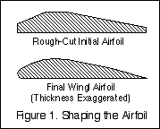 Next, use a balsa planer or a sanding block with coarse paper (Iuse 60 grit cut from a belt-sander belt and placed in a hand sandingblock) to rough-cut the airfoil shape as shown in Figure 1. Also,taper the wing's thickness somewhat out toward the tips so that theairfoil's thickness is constant as a percentage of the wing chord ateach point along the span.